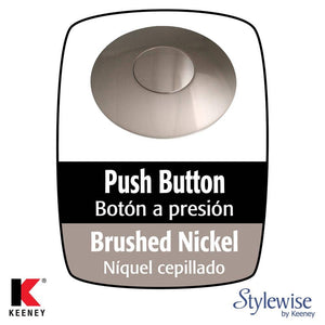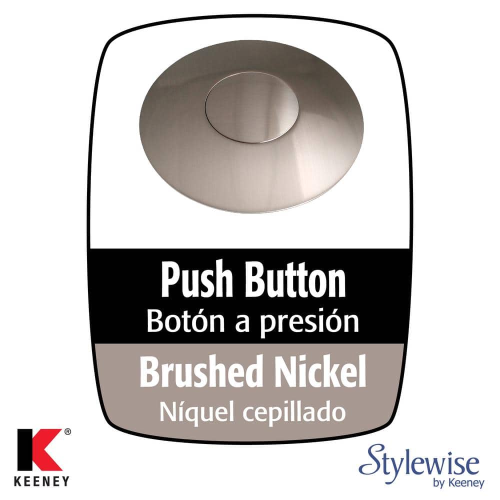 Keeney's decorative push button bathroom sink drain is an ideal solution for use with popular lavatory sinks, specifically pedestal, vessel, drop in, and under-mount styles. It is ideal for sinks without an overflow, featuring a 1-1/4-in standard outlet pipe that fits sink drain holes at least 1.6-in diameter. Its brass body makes for a long-lasting staple for years to come. With an easy push button closure to seal and release the drain, this pop-up drain is easy to clean and instantly updates any bathroom sink setup. Available in polished chrome, brushed nickel, and bronze. Application: Bathroom Sink. Color Family: Brushed Nickel. Color/Finish: Brushed Nickel. Finish: Brushed Nickel. Material: Brass. Pack Size: 1. Plumbing Part Type: Drain. Strainer Included: Yes. Product Depth (in.): 2.75 in. Product Height (in.): 7.75 in. Product Width (in.): 5.00 in. Application: Bathroom Sink. Material: Brass. Plumbing Part Type: Drain.