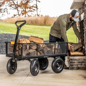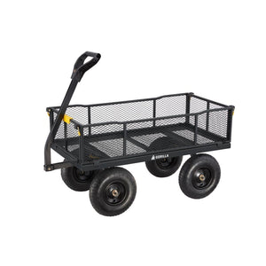 The all-new Gorilla 6 cu. ft. Steel Utility Cart is designed to handle all your toughest outdoor projects. The rugged steel frame is rigid and durable, with a steel mesh deck that is 45 in. L x 23 in. W. If you need to haul larger loads, quickly turn this garden cart into a flatbed cart by removing the sides. Gorilla's exclusive 2-in-1 convertible handle allows the cart to be pulled by hand, or is easily converted to a tow handle. The 13 inch pneumatic tires allow this cart to be incredibly maneuverable on any terrain.When your project requires the perfect hauling solution, this Gorilla Cart ensures that nothing gets left behind.. Bin Material: Steel. Capacity (cu. ft.) - Total: 6 cu ft. Color: Black. Features: Removable Sides,Towable,Zero-Turn Steering. Handle Material: Steel. Number of Wheels: 4. Product Weight (lb.): 59.5 lb. Tire Type: Pneumatic Tires. Weight Capacity (lb.): 1200 lb. Wheel Material: Rubber. Product Depth (in.): 52 in. Product Height (in.): 42 in. Product Width (in.): 24 in. Wheel Size (in.): 13. Capacity (cu. ft.) - Total: 6 cu ft. Bin Material: Steel. Wheel Material: Rubber. Tire Type: Pneumatic Tires. Handle Material: Steel