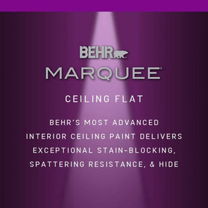 BEHR MARQUEE Stain-Blocking Paint and Primer Ceiling Flat is BEHR's most advanced ceiling paint. It offers One-Coat Hide in over 200 colors. The 100% acrylic formula delivers an antimicrobial-mildew resistant finish and is spatter and drip resistant, making it ideal for every room in your home. Application: Ceiling. Application Method: Brush, Paint Sprayer, Roller. Base Material: Acrylic. Coating Product Category: Paint. Color Family: White. Color/Finish: White. Dry to Touch (min.): 60 min. Interior/Exterior: Interior. Kit: No. Paint & Primer in One: Yes. Paint/Stain Clean Up: Soap & Water. Paint/Stain Features: Mildew Resistant, Splatter Resistant. Sheen: Flat/Matte. Surface Material Use: Ceiling, Drywall, Plaster. Time before recoating (hours): 2. Container Size: 1 Gallon. Coverage Area (sq. ft.): 400 sq ft.