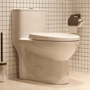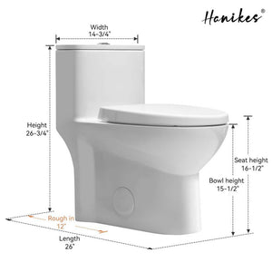 This Hanikes white 1-piece toilet occupies minimal space while offering the spaciousness of an elongated bowl. This high-efficiency unit delivers 1.1 GPF for liquid flushes and 1.6 for full flushes, both options easily located at the top-mounted push button. This toilet features integrated tank-to-bowl construction for easy cleaning and its soft lines and sleek curves create an elegant design. While conserving water so you can save on your utility bills, this vitreous China-construction toilet is crack-resistant and includes all necessary installation hardware and a slow-close seat.. Bowl Height: Chair Height. Bowl/Seat Shape: Elongated. Color Family: White. Color/Finish: White. Features: Compact,Concealed Trapway,Skirted Design,Soft Close. Flushing Technology: Siphonic Jet. Flushing Type: Dual Flush. Gallons Per Flush: Dual Flush: 1.1/1.6. Handle Location: Top. Included: Bolts,Lid,Toilet Seat,Wax Ring. MaP Performance Rating: 500. Material: Vitreous China. Mount Location: Floor Mount. Product Weight (lb.): 94.79 lb. Returnable: 90-Day. Rough In Size: 12 inch Rough In. Seat Front Type: Closed. Toilet Type: One-Piece. Trapway Diameter (in.): 2 in.. Trip Lever Location: Top. Certifications and Listings: IAPMO Certified. Product Depth (in.): 24 in. Product Height (in.): 27.16 in. Product Width (in.): 14.37 in. Bowl Height: Chair Height. Bowl/Seat Shape: Elongated. Rough In Size: 12 inch Rough In. Flushing Type: Dual Flush. Flushing Technology: Siphonic Jet. Features: Skirted Design. Features: Soft Close. Trip Lever Location: Top