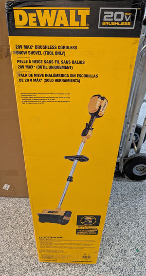 DEWALT 20V MAX 10 in. Cordless Snow Shovel - Your Reliable Partner for Winter Snow Removal Take on winter's toughest challenges with the DEWALT 20V MAX 10 in. Cordless Snow Shovel, now enhanced with a stronger, high-efficiency brushless motor to deliver superior performance. This upgrade ensures smooth, uninterrupted operation even in heavy, wet snow. Designed as part of the DEWALT 20V MAX Tool Platform, this cordless snow shovel combines convenience with professional-grade power. Weighing only 13.23 lbs., this lightweight tool is easy to maneuver, while the adjustable pole allows you to customize the length for a comfortable, strain-free experience. The 10 in. clearing width and 6 in. clearing depth make it ideal for efficiently tackling snow on driveways, sidewalks, decks, and patios. With an adjustable 60 guide plate, you can direct snow exactly where you want it, throwing it up to 22 ft. away with precision and control. Powered by a 4Ah battery (sold separately), this snow shovel provides up to 15 minutes of runtime, allowing you to clear essential areas quickly and effectively. The brushless motor not only enhances runtime but also extends the tool's lifespan, ensuring season-after-season reliability. Engineered for durability and ease of use, the DEWALT 20V MAX Cordless Snow Shovel is built to withstand harsh winter conditions while reducing the physical strain of snow removal. Make snow removal a hassle-free task with DEWALT's trusted performance.. Assembly Required: Yes. Auger Material: Plastic. Battery Amp Hours: 4.0. Battery Power Type: Lithium Ion. Battery Run Time (min.): 15. Battery Voltage (V): 20V. Battery/Charger: Tool Only. Body Material: Plastic. Charge Time (hours): 1. Charger Included: Charger Not Included. Chute Material: Plastic. Chute Turning Radius (Degrees): 60. Clearing Surface Type: Paved. Drive Type: Push. Engine Make: OEM Branded Engine. Engine Torque (ft.-lb.): 0. Features: Adjustable Handle Height,Auger Assisted,Brushless Motor,Chute Control,Electric Start,Hand Push. Maximum Throwing Distance (ft.): 20. Number of Batteries Required: 1. Number of Forward Speeds: 1. Number of Reverse Speeds: 0. Number of Total Batteries Included: 0. Pitch Control: Manual. Plowing Capacity (lbs/min): 0. Power Type: Battery. Product Weight (lb.): 13.23 lb. Recommended Terrain: Flat,Sloped. Refurbished: No. Snow Equipment Product Type: Cordless Electric Snow Blower. Start Type: Switch. Traction: Other. Type of Snow: Fluffy,Light,Wet. Certifications and Listings: ETL Listed. Assembled Depth (in.): 9.0 in. Assembled Height (in.): 64.9 in. Assembled Width (in.): 12.2 in. Auger Diameter (in.): 4.6. Clearing Width (in.): 10 in. Ideal Snow Depth (In.): 6. Intake Height (in.): 6. Tire Height (in.): 0. Tire Width (in.): 0. Power Type: Battery. Type of Snow: Wet. Traction: Other. Battery Voltage (V): 20V. Features: Electric Start