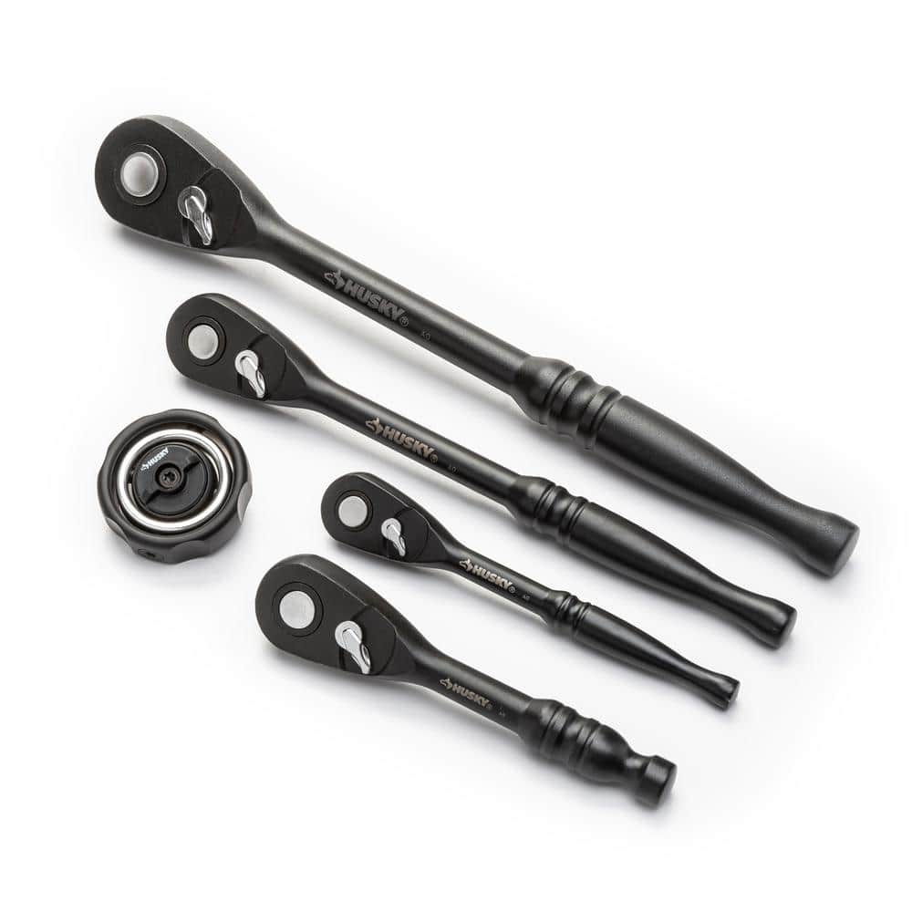 The dual-pawl technology of the Husky 100-position 1/4 in.,3/8 in., and 1/2 in. ratchets features an ultra-narrow 3.6 swing arc to provide access to hard-to-reach-fasteners. The longer handles increase and improve overall leverage. The Husky Gimbal Ratchet boasts an innovative design that provides multi-directional rotation for easier access in hard-to-reach areas. The 100-tooth internal ratcheting mechanism allows the gimbal ratchet to engage fasteners with as little as a 3.6 rotation. Perfect for high speed and low-torque applications, this ratchet is ideal for even the most confined areas. The industrial-grade black finish gives these tools a sleek look while adding durability and corrosion prevention. Ratchet set comes neatly stored in EVA foam tray which will fit in most storage drawers.. Features: No Additional Features. Hand Tool Type: Ratchet. Individual/Set: Set. Number of Pieces:. SAE vs. Metric: Metric,SAE. Tools Product Type: Hand Tool. Number of Pieces: 5. Hand Tool Type: Ratchet. Individual/Set: Set