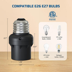 Built-in advanced dusk to dawn sensor, automatically turn light on/off from dusk to dawn; turn your standard light fixture into automatic dusk to dawn light, No manual adjustment; NOTE: Please ensure no obstacles block the sensor and light source and don't use light sensor socket with opaque or forsted-glass light fixtures. No wiring and programming needed, simply screw light bulb into dusk to dawn light sockets, attach it to light fixtures; ensure the sensor faces a natural light source indoors and under shelter outdoors. Equipped with delay OFF function, prevent bulbs from repeatedly flickering due to sudden light sources; after 60s or longer light source motion - Auto Turn Bulbs Off.. Amperage (A): 1 A. Color Family: Black. Color/Finish: Black. Commercial/Residential: Residential. Compatible Bulb Type: CFL,Halogen,Incandescent,LED. Durability: Not Applicable. Electrical Features: Programmable. Indoor/Outdoor: Indoor,Outdoor. Material: Thermoplastic. Maximum Amperage (A): 1 A. Mounting Type: Screw-In,Wall Mounted. Product Weight (lb.): 0.15 lb. Rating: General Purpose. Voltage: 125 volt. Voltage (V): 125 V. Wattage (W): 100 W. Certifications and Listings: ETL Listed. Product Depth (in.): 1.73 in. Product Height (in.): 2.73 in. Product Width (in.): 1.73 in