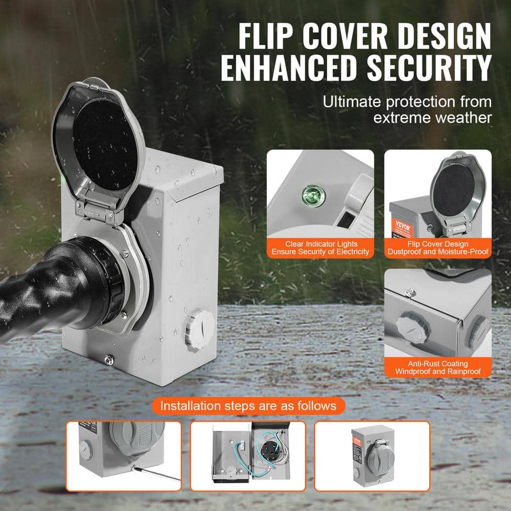 50A 15 ft. Generator Cord and Power Inlet Box. Our generator cord and power inlet box kit are designed to deliver stable and secure power output to your home or RV, even in outdoors, in power outage situations, or adverse weather. Whether facing rain, wind, or extreme temperatures, our kit keeps you powered up when you need it most.. Cord Color: Black. Cord Designation: STW. Cord Filling: Solid Filled. Cord Length (ft.): 15 ft. Durability: Cold Weather Rated,Oil Resistant,Water Resistant. Features: Flexible,Overload Protection,Twist-Lock Plug. Gauge: 8. Indoor/Outdoor: Indoor/Outdoor. Jacket Material: PVC. Maximum Amperage (A): 50 A. Maximum Wattage: 6000. Minimum Temperature (F): -40 F. Number of Conductors: 4. Number of Receptacles: 1. Pack Size: 1. Plug Configuration: 14-50. Plug Housing Material: PVC. Receptacle Configuration: SS2-50. Voltage (V): 125 V. Weight (lb.): 15.7 lb. Certifications and Listings: ETL Listed. Cord Thickness (in.): 1 in. Wire Gauge: 8. Cord Length (ft.): 15 ft. Maximum Amperage (A): 50 A. Gauge: 8. Voltage (V): 125 V. Number of Outlets: 1. Indoor/Outdoor: Indoor/Outdoor. Features: Twist-Lock Plug. Wire Gauge: 8
