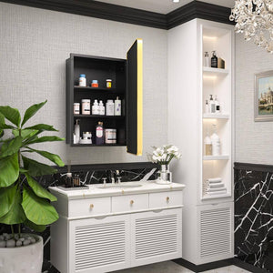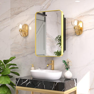 The KeonJinn Aluminum Framed Medicine Cabinets Premium aluminum door with a matte finish, framed with an elegantly beveled mirror. Multiple layers of adjustable shelves easily hold your toiletries and bath essentials. A matching mirrored light fixture (sold separately) makes an attractive and convenient accessory and the included side kit allows you to choose between recessed or surface-mount installation. This bathroom medicine cabinet comes 95% assembled, customers only need to set the shelves into the cabinet.. Assembly Required: Ready to Assemble. Color Family: Gold. Color/Finish: Gold. Door Swing: Left. Door Type: Single-View. Features: Corner,Easy Hang. Included: Mounting Hardware. Material: Aluminum Alloy. Medicine Cabinets Size: Medium. Mount Style: Recessed/Surface Mount. Mount Type: Recessed/Surface Mount. Number of Shelves: 2 Shelves. Product Weight (lb.): 19 lb. Recessed Opening Depth (in.): 3. Shape: Rectangular. Weight Capacity (lb.): 30 lb. Product Depth (in.): 5 in. Product Height (in.): 24 in. Product Width (in.): 16 in. Recessed Opening Height (in.): 18.63. Recessed Opening Width (in.): 13.8. Shelf width (in.): 13.8. Mount Style: Recessed/Surface Mount. Medicine Cabinets Size: Medium. Door Swing: Left. Door Type: Single-View. Shape: Rectangular. Assembly Required: Ready to Assemble. No of Shelves: 2 Shelves. Included: Mounting Hardware