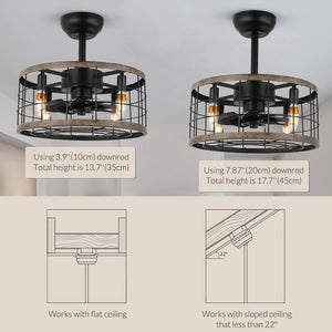 18 in. farmhouse ceiling fan with lights can help improve the quality of air you breathe by preventing stagnant air from hosting bacteria and viruses. This black rustic caged ceiling fan uses a double-layer painted metal frame and operates quietly and efficiently to circulate air throughout your kitchen, dining room, or bedroom. Provides additional ambient lighting (require 4 x E12 bulbs) while enjoying the cool wind. Its extra reversible motor function keeps your house comfortable year-round and saves you money on air conditioning costs. The modern ceiling fan with lights is a great alternative to traditional ceiling fans.. Actual Color Temperature (K): 0. Blade Color: Black. Blade Color Family: Beige,Black. Blade Material: Acrylonitrile Butadiene Styrene (ABS). Blade Pitch: 0. Ceiling Fan Design: Caged,Propeller,Standard. Ceiling Fan Size: Small. Color Temperature: Bright White. Commercial/Residential: Residential. Compatible Bulb Type: Eco-Incandescent. Control Type: Remote,Switch. Damp/Wet Rating: Dry Rated (Indoor). Dimmable Capability: Non Dimmable. Durability: Corrosion Resistant. Features: Quick & Easy Install,Retractable,Reversible Rotation,Timer. Housing Color: Black. Housing Color Family: Black. Housing Material: Steel. Included: Downrod Included,Light Kit Included,Shade(s) Included,Wall Control Included. Indoor/Outdoor: Indoor. Light Bulb Base Code: E12. Light Bulb Type Included: No Bulbs Included. Location Use: Barn,Bedroom,Dining Room,Foyer,Garage,Kids Room,Kitchen,Living Room,Nursery,Office,Warehouse. Lumens: 0. Max. Airflow (CFM): 1543. Max. Bulb Wattage (W): 40 W. Max. Motor Speed (RPM): 1030 RPM. Motor Type: DC. Mounting Type: Angled Mount,Downrod Mount. Number of Blades: 8. Number of Lights: 4. Number of Speeds: 6. Recommended Room Size: Small Room (250 sq. ft.). Shade Material: Metal. Shade Shape: Bell,Dome,Drum,Round. Certifications and Listings: No Certifications or Listings. Assembled Depth (in.): 17.7 in. Assembled Height (in.): 7.0 in. Assembled Weight (lbs.): 9.1. Assembled Width (in.): 17.7 in. Blade Length (in.): 3.9 in. Blade Width (in.): 3.9 in. Downrod Length (in.): 4. Fan Blade Span (in.): 9.8 in. Recommended Room Size: Small Room (250 sq. ft.). Number of Blades: 8. Mounting Type: Downrod Mount. Indoor/Outdoor: Indoor. Location Use: Bedroom. Motor Type: DC. Mounting Type: Angled Mount