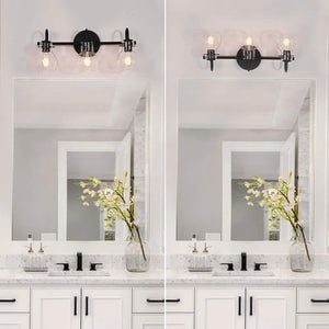 Perfect modern bathroom wall light over a mirror to brighten your bathroom or other interiors. This gorgeous 3-light black modern bathroom vanity light is made of sturdy metal and clear globe glass shades to show off your trendy light bulbs. This modern farmhouse black vanity wall light fixture can easily be installed with safe use in both damp locations and dry locations. Light up your space with this LNC modern industrial bathroom vanity light fixture. This 3-light wall lights fixture can be used to enhance any room like the bathroom, powder room, bedroom, living room, study, over your cosmetic vanity table, or in your hallway. Perfect for urban industrial, modern, transitional or modern farmhouse style interiors. This black wall mount lights fixture is crafted of sturdy metal and clear globe glass shades to complement your lovely space. The skillful combination of a unique modern industrial design and farmhouse style instantly adds mood when powering on. Light fixture dimension: this modern black vanity wall light measures 22 in. W x 7 in. D x 9 in. H Canopy dimension: 6 in. Dia. Bulbs requirements: this globe wall sconce requires 3 x Max 60-Watt E26 base bulbs (not included), LED or incandescent bulbs compatible. For multi-purposes, this bath bar wall mounted sconce can be installed facing upwards or downwards to best meet your needs. Dimmable vanity light: this industrial wall light with modern accents is fully dimmable when used with a dimmer switch (not included) to set the mood. This industrial bathroom wall light for living room/bedroom is UL Listed for safe use in damp locations. Number of Lights: 3 Light. Recommended Vanity Size (in.): 24. Fixture Width (In.): 22 in. Shade Material: Clear Glass.