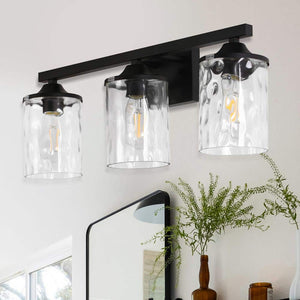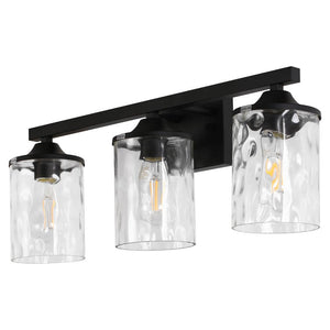 Elevate your morning routine with this 3-light matte black vanity light, where timeless design meets modern clarity. The hammered glass shades scatter light beautifully, adding texture and brilliance above your mirror. Ideal for bathrooms or dressing areas, this linear fixture pairs classic style with functional lighting that's always on point.. Compatible Bulb Type: Eco-Incandescent,Halogen,LED. Damp/Wet Rating: Damp Rated. Features: Dimmable. Fixture Color Family: Black. Fixture Color/Finish: Matte Black. Fixture Material: Metal. Included: No Additional Items Included. Light Bulb Base Code: E26. Light Bulb Type Included: No Bulbs Included. Max. Bulb Wattage (W): 60 W. Mounting Position: Non-Directional. Number of Lights: 3. Power Source: Hardwired. Product Weight (lb.): 9.9 lb. Recommended Light Bulb Shape Code: ST58. Recommended Vanity Size (in.): 25. Shade Color Family: Clear. Shade Material: Glass. Shade Shape: Cylinder. Certifications and Listings: No Certifications or Listings. Fixture Height (in.): 6 in. Fixture Width (in.): 23 in. Mounting Plate Height (in.): 5 in. Mounting Plate Width (in.): 21 in. Product Depth (in.): 5 in. Fixture Width (in.): 23 in. Number of Lights: 3. Recommended Vanity Size (in.): 25. Fixture Material: Metal. Shade Material: Glass. Features: Dimmable. Shade Shape: Cylinder. Damp/Wet Rating: Damp Rated