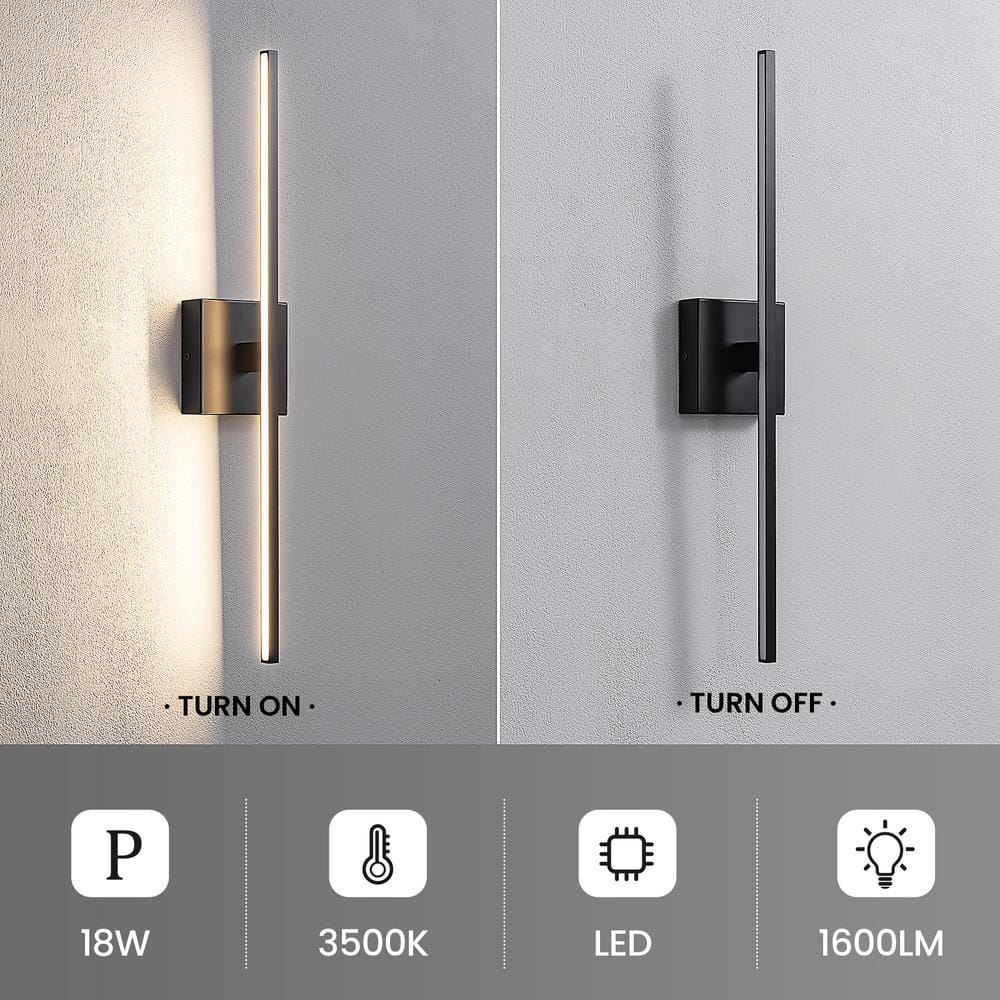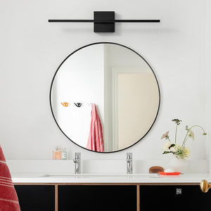 This modern LED vanity light features a sleek linear design with a fully enclosed, waterproof and fog-resistant acrylic shade. The 360 rotatable light body allows you to easily adjust the light direction (without any tools) to suit your lighting needs. This linear bathroom light fixture adopts high-quality LED chips, no flicker and no eye damage, can save up to 80% electricity and is environmentally friendly.. Actual Color Temperature (K): 3500. Color Rendering Index (CRI): 85. Color Temperature: Warm White. Damp/Wet Rating: Damp Rated,Dry Rated. Features: Dimmable,Light Bar,Rust Resistant. Fixture Color Family: Black. Fixture Color/Finish: Black. Fixture Material: Metal. Included: Mounting Hardware. Light Bulb Type Included: Integrated LED. Lumens: 1600. Mounting Position: Non-Directional. Number of Lights: 1. Power Source: Hardwired. Product Weight (lb.): 1.5 lb. Recommended Vanity Size (in.): 26. Shade Color Family: Black. Shade Material: Metal. Shade Shape: Rectangular. Wattage (W): 18 W. Certifications and Listings: ETL Listed. Fixture Height (in.): 4.5 in. Fixture Width (in.): 24 in. Mounting Plate Height (in.): 4.5 in. Mounting Plate Width (in.): 4.5 in. Product Depth (in.): 3 in. Fixture Width (In.): 24 in. Number of Lights: 1. Recommended Vanity Size (in.): 26. Fixture Material: Metal. Features: Dimmable. Features: Rust Resistant. Features: Light Bar. Shade Shape: Rectangular