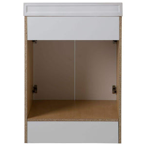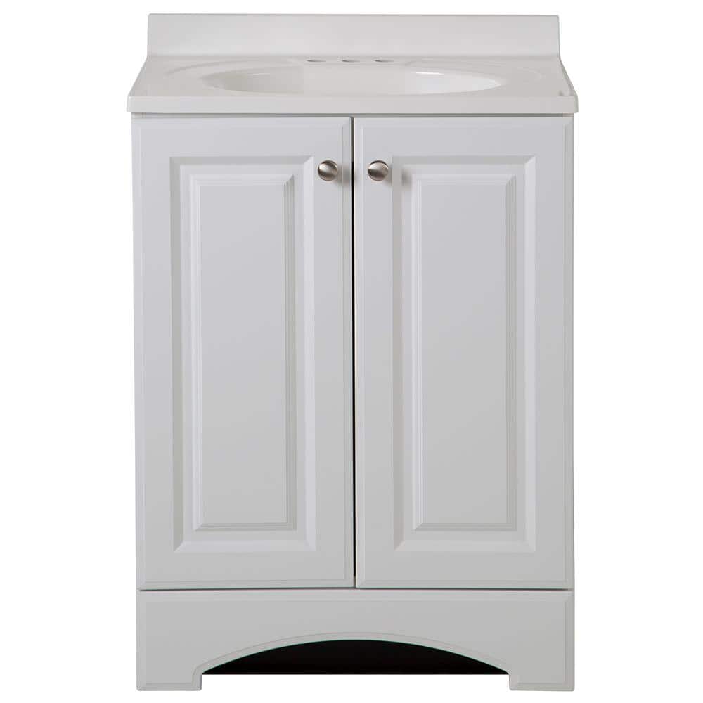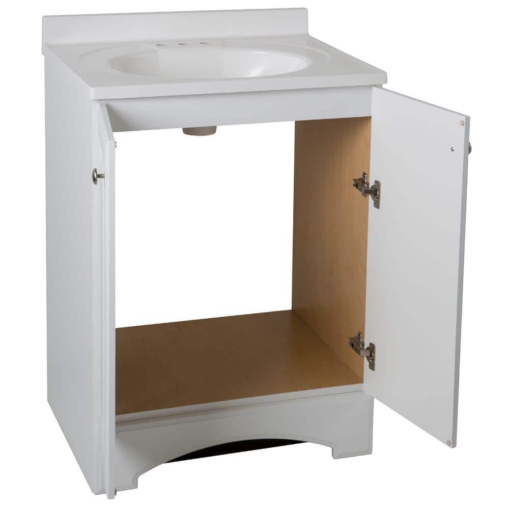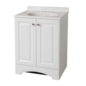 The Glacier Bay Vanity in White with Cultured Marble Vanity Top has classic styling that complements a wide variety of bath or powder room decor. Featuring a smooth white finish for a clean and fresh look, this vanity has a white vanity top with an integral white bowl and is pre-drilled for a 4 in. centerset faucet. The two full-size doors are accented with nickel hardware and conceal a large interior cabinet that offers ample storage space. Fully assembled for easy installation, a matching backsplash is included to help protect your wall and vanity back from water damage.. Nickel hardware and toe kick add a decorative touch. Base nail glides included to prevent floor damage. Pre-drilled for 4 in. centerset faucet; faucet sold separately. 6-way adjustable and concealed hinges provide a clean, seamless look. Classic styling with fresh white finish and durable MDF construction is ideal for a wide range of decor styles. 24-1/2 in. W x 18.69 in. D is suitable for a smaller bathroom or powder room. 2 large rigid thermo foil doors for lasting durability and beauty. Easy to maintain and durable white cultured marble vanity top includes an integral white bowl. 2-1/2 in. H backsplash helps protect wall and vanity back from water damage. Product may vary by store. Interior cabinet provides ample storage for everyday bath items. Requires 4 in. centerset faucet. Suitable for residential and commercial use. Fully assembled for easy installation.