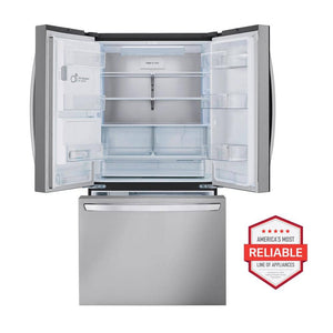 This LG 3-door counter depth refrigerator can not only stand flush with your countertop to provide a seamless look, it's got the room to store all your family's favorite foods. This spacious refrigerator is equipped with Dual Ice. This refrigerator is a Counter-Depth MAX three-door refrigerator.. Appliance Category: Refrigerator. Appliance Series: Not Applicable. Appliance Type: French Door Refrigerator. Built-In and Standard Type: French Door. Color - Appliance Cabinet: Stainless. Color - Door Handle(s): Stainless Steel. Color/Finish: Print Proof Stainless Steel. Color/Finish Family: Stainless Steel. Defrost Type: Auto / Cycle. Dispenser Location: External Ice Dispenser,External Water Dispenser. Door Finish: Smooth. Energy Consumption (kWh/year): 699. Energy Efficiency Tier Rating: Not CEE rated. Freezer Capacity (cu. ft.): 8.6 cu ft. Freezer Door Type: Pull Out Drawer. Freezer Features: Adjustable Temperature Control,Digital Temperature Display,LED Light Type,Open Door Alarm,Safety Lock. Freezer Type: Drawer Freezer. General Features: Child Lock,Digital Temperature Control,Door Alarm,LED Light Type,Sabbath Mode. Handle Type: Bar Handle. Hardware Color/Finish: Stainless Steel. Hardware Color/Finish Family: Stainless Steel. Ice Maker Features: Ice Maker,Removable Basket. Ice/Water Dispenser: Both. Indoor/Outdoor: Indoor. Installation Depth: Counter Depth. Installation Type: Free Standing. Number of Doors: 3 Door. Number of Drawers: Single Drawer. Number of Freezer Baskets/Bins: 2 Baskets/Bins. Number of Freezer Shelves: No Shelves. Number of Refrigerator Shelves: 8 Shelves. Operational Features: Fresh Air Filter,Sabbath Mode. Overall Product Height (in.): 70 in. Power Options: Hardwired. Product Weight (lb.): 291 lb. Refrigeration Dispenser Features: Crushed Ice,Cubed Ice,Water Dispenser. Refrigerator Capacity (cu. ft.): 16.9 cu ft. Remote Access: Remote Access. Requires Hub?: No Hub Required. Returnable: Non-Returnable. Shelf Material - Freezer: No Shelf. Shelf Material - Refrigerator: Glass. Smart Home: Smart Home Enabled. Smart Home Protocol: Wi-Fi. Storage Features: Adjustable Racks,Crisper Drawer,Gallon Door Storage,Removable Shelves. Temperature Control Type: Internal Digital. Total Capacity (cu. ft.): 25.5 cu ft. Voice Control Hub Required: No Hub Required for Voice Control. Water Filter Replacement Model#: LT1000P. Works With: Alexa, Google, SmartThinQ. Certifications and Listings: ADA Compliant,CSA Listed,Energy Star. Depth (Excluding Handles) (in.): 29.125 in. Depth (Including Handles) (in.): 31.625 in. Depth (Less Door) (in.): 24.75 in. Depth With Door Open 90 Degrees (in.): 43.625 in. Height to Top of Door Hinge (in.): 70.25 in. Height to Top of Refrigerator Case (in.): 68.875 in. Height to Top of Refrigerator Door (in.): 70.25 in. Product Depth (in.): 31.625 in. Product Height (in.): 70.25 in. Product Width (in.): 35.75 in. Refrigerator Width (in.): 35.75 in. Installation Depth: Counter Depth. Depth (Excluding Handles) (in.): 29.125 in. Total Capacity (cu. ft.): 25.5 cu ft. Dispenser Features: Water Dispenser. Overall Product Height (in.): 70 in. Dispenser Features: Cubed Ice. Dispenser Features: Crushed Ice. Dispenser Location: External Water Dispenser