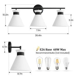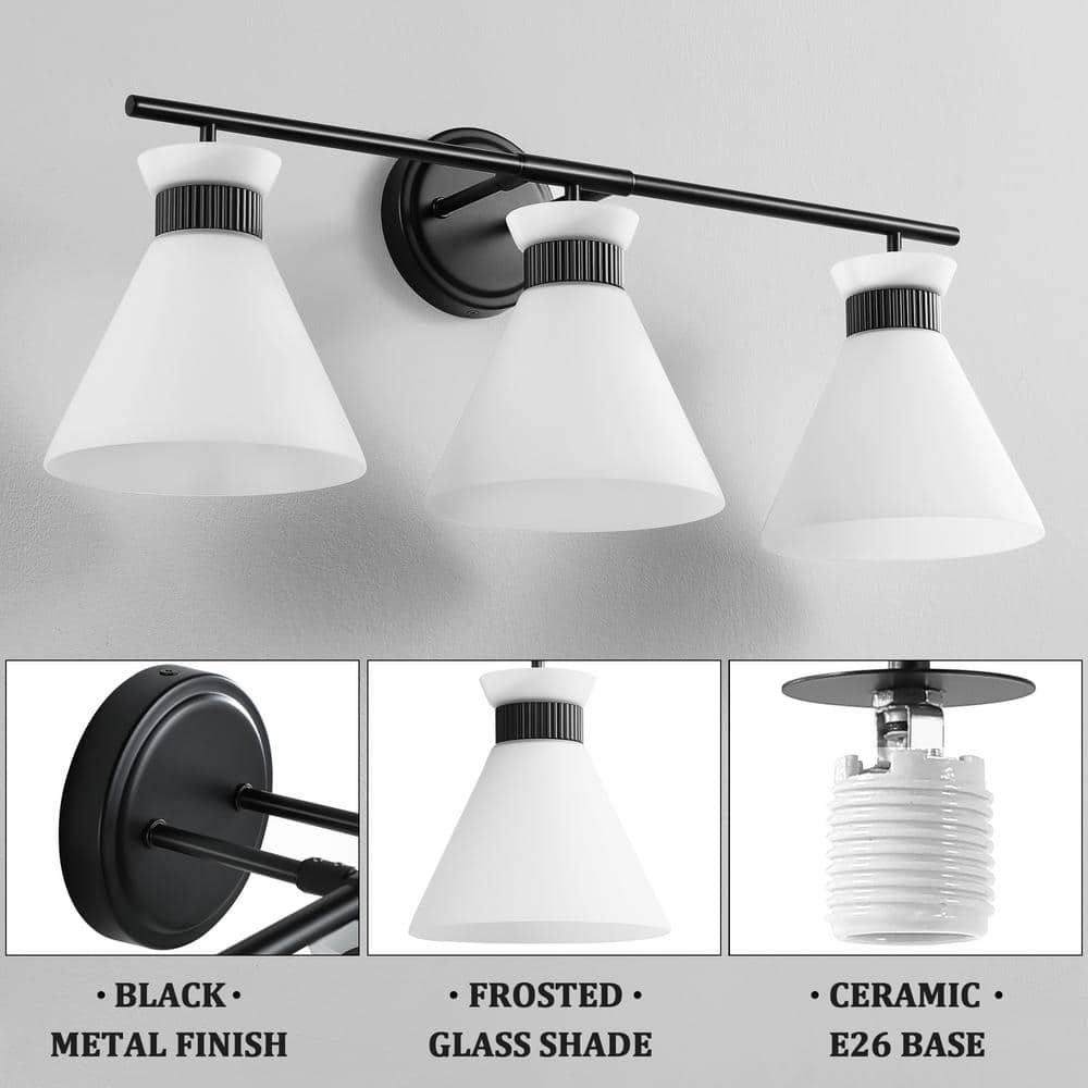 Introducing our modern Bathroom Vanity Light, crafted with high-quality metal for durability and strength. Paired with conical frosted glass shades, it evenly diffuses light to create a soft and inviting ambiance. Its unique design adds an elegant and stylish touch to your bathroom, making it the epitome of sophistication.. Compatible Bulb Type: CFL,Halogen,LED. Damp/Wet Rating: Damp Rated,Dry Rated. Features: Dimmable,Rust Resistant. Fixture Color Family: Black. Fixture Color/Finish: Black. Fixture Material: Metal. Included: Mounting Hardware,Shade(s). Light Bulb Base Code: E26. Light Bulb Type Included: No Bulbs Included. Max. Bulb Wattage (W): 60 W. Mounting Position: Light Facing Down. Number of Lights: 3. Power Source: Hardwired. Product Weight (lb.): 6 lb. Recommended Light Bulb Shape Code: ST64. Recommended Vanity Size (in.): 28. Shade Color Family: White. Shade Material: Glass. Shade Shape: Cone. Certifications and Listings: UL Listed. Fixture Height (in.): 10.2 in. Fixture Width (in.): 26.4 in. Mounting Plate Height (in.): 4.7 in. Mounting Plate Width (in.): 4.7 in. Product Depth (in.): 8.7 in. Fixture Width (In.): 26.4 in. Number of Lights: 3. Recommended Vanity Size (in.): 28. Fixture Material: Metal. Shade Material: Glass. Features: Dimmable. Features: Rust Resistant. Shade Shape: Cone