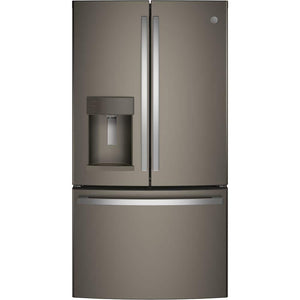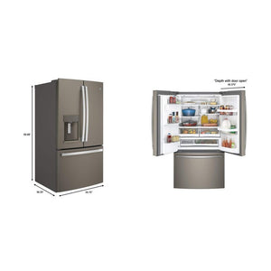 At GE Appliances, we bring good things to life, by designing and building the world's best appliances. Our goal is to help people improve their lives at home by providing quality appliances that were made for real life. Whether it's enjoying the tradition of making meals from scratch or tackling a mountain of muddy jeans and soccer jerseys, GE Appliances are crafted to support any and every task in the home.. Appliance Category: Refrigerator. Appliance Series: Not Applicable. Appliance Type: French Door Refrigerator. Built-In and Standard Type: French Door. Color - Appliance Cabinet: Gray. Color - Door Handle(s): Slate. Color/Finish: Fingerprint Resistant Slate. Color/Finish Family: Slate. Defrost Type: Auto / Cycle. Dispenser Location: External Ice Dispenser,External Water Dispenser. Door Finish: Textured. Energy Consumption (kWh/year): 725. Energy Efficiency Tier Rating: Not CEE rated. Freezer Capacity (cu. ft.): 9.17 cu ft. Freezer Door Type: Pull Out Drawer. Freezer Features: Adjustable Leveling Legs,Adjustable Temperature Control,LED Light Type,Sliding-Bulk Storage Baskets. Freezer Type: Drawer Freezer. General Features: Child Lock,Door Alarm,Hidden Hinge,Interior Light,LED Light Type,Smudge-Proof. Handle Type: Bar Handle. Hardware Color/Finish: Stainless Steel. Hardware Color/Finish Family: Stainless Steel. Ice Maker Features: Automatic Ice Level Control/Shutoff,Control Lockout,Filtered Ice,Removable Basket. Ice/Water Dispenser: Both. Indoor/Outdoor: Indoor. Installation Depth: Standard Depth. Installation Type: Free Standing. Number of Doors: 3 Door. Number of Drawers: Single Drawer. Number of Freezer Baskets/Bins: 2 Baskets/Bins. Number of Freezer Shelves: No Shelves. Number of Refrigerator Shelves: 5 Shelves. Operational Features: Sabbath Mode. Overall Product Height (in.): 70 in. Product Weight (lb.): 370 lb. Refrigeration Dispenser Features: Crushed Ice,Cubed Ice,Dispenser Control Lock-Out,Water Dispenser,Water Filtration. Refrigerator Capacity (cu. ft.): 18.7 cu ft. Returnable: Non-Returnable. Shelf Material - Freezer: Plastic. Shelf Material - Refrigerator: Glass. Storage Features: Adjustable Door Storage,Deli Drawer,Gallon Door Storage,Removable Shelves,Spill Proof Shelves. Temperature Control Type: External Digital. Total Capacity (cu. ft.): 27.8 cu ft. Water Filter Replacement Model#: XWFE. Certifications and Listings: ADA Compliant,UL Listed. Depth (Excluding Handles) (in.): 34.75 in. Depth (Including Handles) (in.): 36.25 in. Depth (Less Door) (in.): 29.375 in. Depth With Door Open 90 Degrees (in.): 48.375 in. Height to Top of Door Hinge (in.): 69.875 in. Height to Top of Refrigerator Case (in.): 69 in. Product Depth (in.): 36.25 in. Product Height (in.): 69.875 in. Product Width (in.): 35.75 in. Refrigerator Width (in.): 35.75 in. Installation Depth: Standard Depth. Depth (Excluding Handles) (in.): 34.75 in. Total Capacity (cu. ft.): 27.8 cu ft. Dispenser Features: Water Dispenser. Overall Product Height (in.): 70 in. Dispenser Features: Cubed Ice. Dispenser Features: Crushed Ice. Dispenser Features: Water Filtration