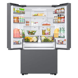 Samsung Mega Capacity 3-Door French Door Counter Depth refrigerator features 27 cu. ft. capacity. Dual Auto Ice Maker makes 2-types of ice - cubed, or Ice Bite that chill your drink faster. A flat-front design with recessed drawer handle blends beautifully into your kitchen.. Appliance Category: Refrigerator. Appliance Series: Not Applicable. Appliance Type: French Door Refrigerator. Built-In and Standard Type: French Door. Color - Appliance Cabinet: White. Color - Door Handle(s): Stainless look. Color/Finish: Stainless look. Color/Finish Family: Stainless Look. Defrost Type: Auto / Cycle. Dispenser Location: Internal Ice Dispenser,Internal Water Dispenser. Door Finish: Smooth. Energy Consumption (kWh/year): 657. Energy Efficiency Tier Rating: Not CEE rated. Freezer Capacity (cu. ft.): 7.5 cu ft. Freezer Door Type: Pull Out Drawer. Freezer Features: No Additional Features. Freezer Type: Drawer Freezer. General Features: Door Alarm,LED Light Type. Handle Type: Pocket Handle. Hardware Color/Finish: Stainless Steel. Hardware Color/Finish Family: Stainless Steel. Ice Maker Features: Ice Maker. Ice/Water Dispenser: Ice Only. Indoor/Outdoor: Indoor. Installation Depth: Counter Depth. Installation Type: Free Standing. Number of Doors: 3 Door. Number of Drawers: Single Drawer. Number of Freezer Baskets/Bins: 1 Basket/Bin. Number of Freezer Shelves: No Shelves. Number of Refrigerator Shelves: 4 Shelves. Operational Features: No Additional Features. Overall Product Height (in.): 70 in. Power Options: Plug-in. Product Weight (lb.): 282 lb. Refrigeration Dispenser Features: Dual Ice Maker,No Dispenser. Refrigerator Capacity (cu. ft.): 19 cu ft. Remote Access: No Remote Access. Requires Hub?: No Hub Required. Returnable: Non-Returnable. Shelf Material - Freezer: Plastic. Shelf Material - Refrigerator: Glass. Smart Home: Smart Home Enabled. Smart Home Protocol: Wi-Fi. Storage Features: No Additional Features. Temperature Control Type: Internal Digital. Total Capacity (cu. ft.): 27 cu ft. Voice Control Hub Required: No Voice Control. Water Filter Replacement Model#: HAF-QIN. Works With: Homey, Samsung SmartThings. Certifications and Listings: Energy Star. Depth (Excluding Handles) (in.): 25 in. Depth (Including Handles) (in.): 29.5 in. Depth (Less Door) (in.): 25 in. Depth With Door Open 90 Degrees (in.): 44 in. Height to Top of Door Hinge (in.): 70 in. Height to Top of Refrigerator Case (in.): 68.875 in. Height to Top of Refrigerator Door (in.): 70 in. Product Depth (in.): 29.5 in. Product Height (in.): 70 in. Product Width (in.): 35.75 in. Refrigerator Width (in.): 35.75 in. Depth (Excluding Handles) (in.): 25 in. Installation Depth: Counter Depth. Total Capacity (cu. ft.): 27 cu ft. Overall Product Height (in.): 70 in. Height to Top (in.): 68.875 in. No of Doors: 3 Door. Ice Maker Features: Ice Maker. Height to Top of Door Hinge (in.): 70 in