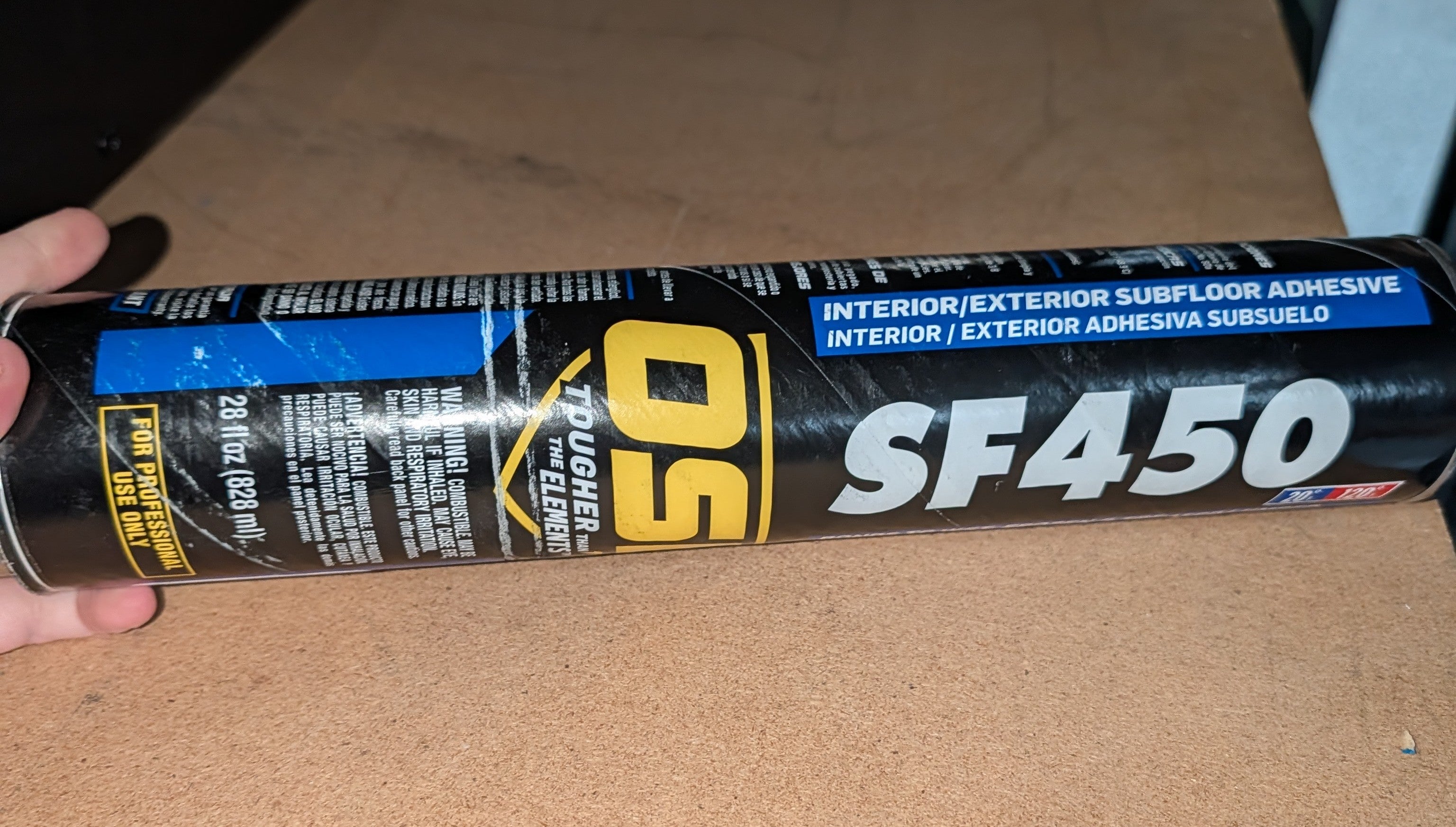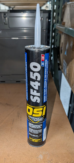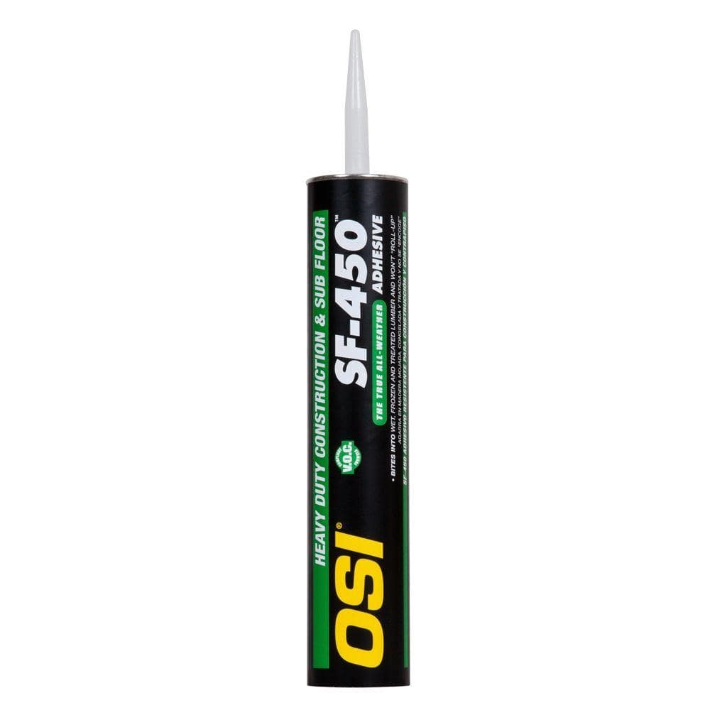 OSI SF 450 Heavy Duty Construction and Sub Floor Adhesive is a Solvent-based, Low VOC formula specifically designed for use installing sub floors in residential applications. The True All-Weather Subfloor Adhesive, SF-450 is formulated for use at temperatures as low as 0 degrees F and has an upper operating range of 100 degrees F. Easy gunning at all temperatures, SF-450 will not roll-up on wet, frozen and treated lumber. Meets ASTM D 3498 standards. SF-450 can be used in most interior and exterior construction projects either on the job or the production line. It bonds all wood to wood assemblies dry, wet or frozen. Primarily designed for onsite bonding of sub-floor and plywood decking to joists during cold weather. SF-450 is suitable for use in drywall, plaster, metal, masonry, concrete, brick, ceramic tile, slate, treated lumber and most other projects requiring an adhesive. Ideal for use in prefab or modular construction.. Adhesion level: High. Adhesive Product Type: Construction Adhesive. Construction adhesive type: Drywall or subfloor. Curing time (hours): 168. Features: Drillable,Moisture Resistant,Sandable,Solvent Resistant,UV Resistant. Number of Tubes Included: 1. Product Weight (oz.): 45.92 oz. Recommended Surfaces: Brick,Coated wood,Drywall,Metal,Painted wood. Set Time (Min.): 10. Product Depth (in.): 8 in. Product Height (in.): 16.625 in. Product Size (oz.): 28. Product Width (in.): 10.5 in