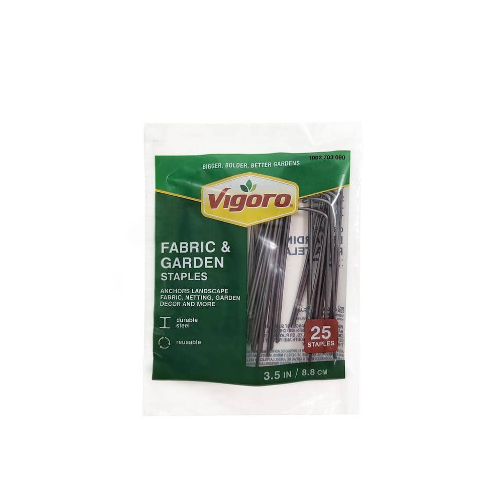 Weed barrier landscape fabric Staples quickly and easily secure landscape fabrics and sod against the elements. Made from strong, weather-resistant steel, these staples will keep whatever they are holding down in place. The curved top is custom-fit for most outdoor applications. Made in Minnesota.. Biodegradable: Yes. Duty Type: Heavy Duty. Hardware Included: No. Landscape Supply Type: Fabric Stake. Outdoor Compatibility: Rust Resistance,Weather Resistance. Pack Size: 25. Product Length (ft.): 0.417 ft. Product Thickness (mm): 25.4 mm. Product Width (ft.): .33 ft