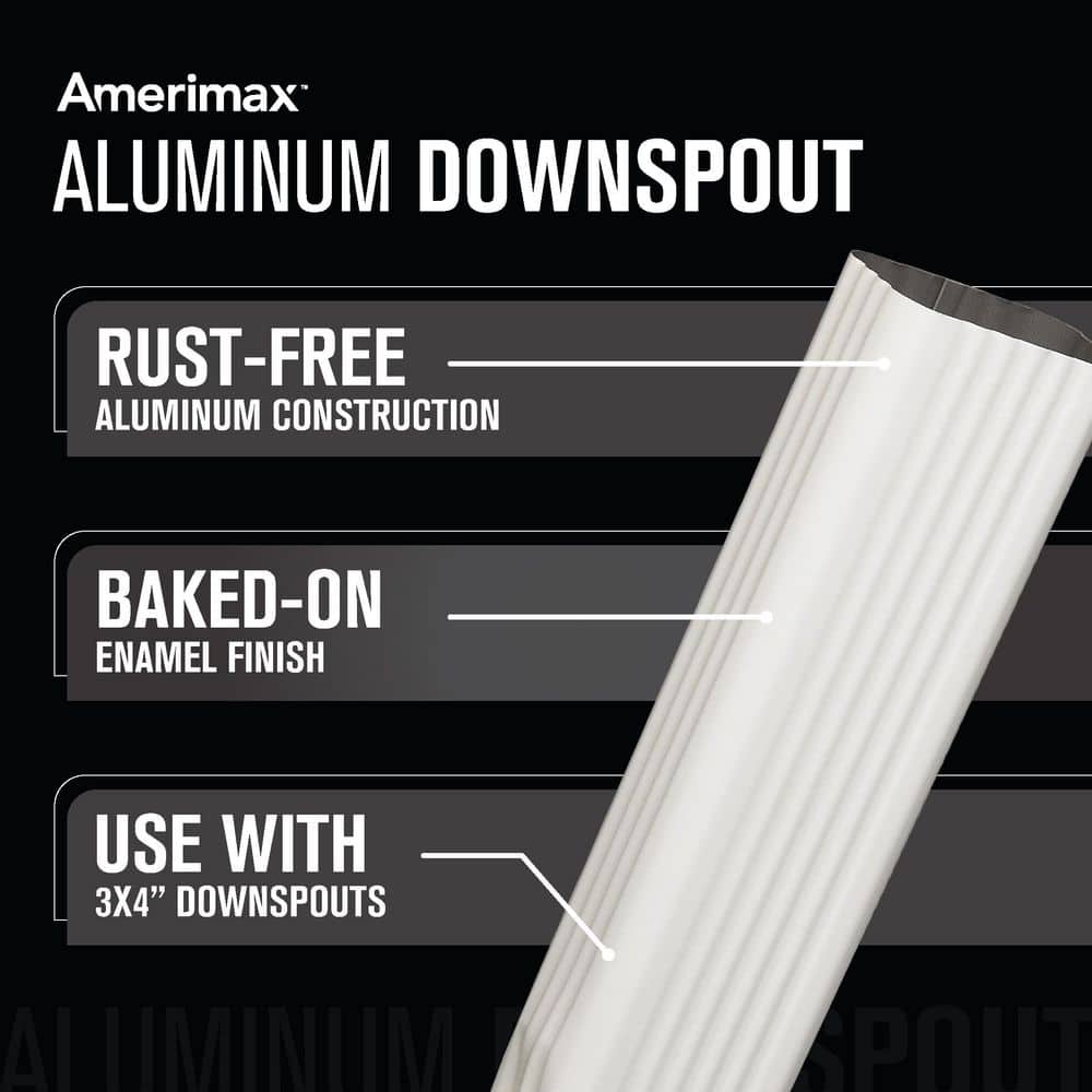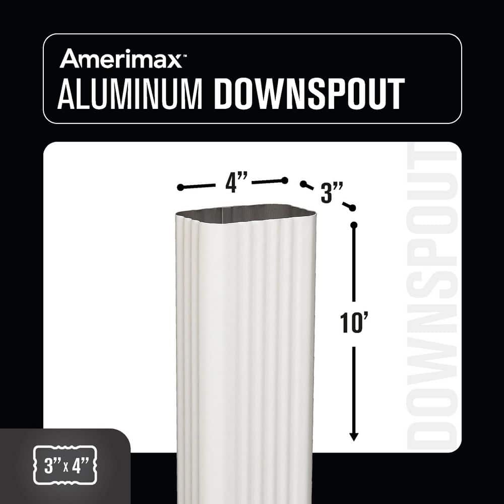The Amerimax Downspout connects to rain gutters to guide the rain along the wall and has a drainage capacity of 464 gallons per minute. This downspout can be attached with downspout bands (not included) and is compatible with 3 in. x 4 in. elbows. This downspout has a rust-free aluminum construction and a white finish.. Color: White. Color Family: White. Downspout Size (in. ): 3 in. x 4 in.. Downspout Type: Gutter Downspout. Features: Paintable,Rustproof. Gutter System Product: Rain Diverters. Material: Aluminum. Product Weight (lb.): 2.728 lb. Product Depth (in.): 3 in. Product Height (in.): 120 in. Product Width (in.): 4 in. Downspout Type: Gutter Downspout. Material: Aluminum. Downspout Size (in. ): 3 in. x 4 in.