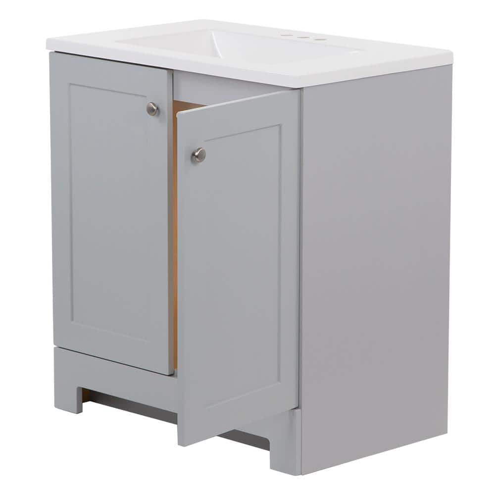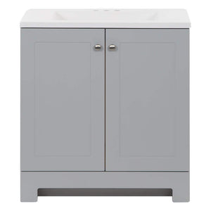 The 30.25 in. W Glacier Bay bathroom vanity in pearl gray features a 2-door cabinet and a white cultured marble vanity top. This soft pearl gray freestanding vanity features a Shaker-style full-overlay design, accented by satin nickel pulls. A predrilled white cultured marble vanity top with an integrated rectangular sink completes this vanity set. Created with convenience in mind, this pre-assembled single-sink bathroom vanity features an open-back design, 6-way adjustable cabinet hinges, and an unattached vanity top for easy installation. 30.25 in. W x 18.75 in. D x 32.89 in. H bathroom vanity maximizes storage in your half bath or powder room. White cultured marble vanity top with a 1 in. H edge profile predrilled for a 4 in. centerset faucet; faucet and drain sold separately. Integrated rectangular sink without an overflow hole to help promote a bacteria-free environment. Satin nickel hardware included. 2-door cabinet provides convenient storage and easy access to your plumbing. Shaker-style profile with a pearl gray vanity finish for a classic look with laminate woodgrain interior. Doors include 6-way adjustable hinges for easy door alignment. Single-sink vanity top is nonporous, making it bacteria-, mold-, and mildew-resistant. Pre-assembled open-back vanity with unattached sink top is ready and easy to install with silicone caulking; caulking sold separately. Laminate furniture-board construction. Coordinating wall mirror sold separately . Slight variations in vanity top hue are normal. Number of Sinks: Single Sink. Cabinet Material: Particle Board. Sink Location: Center. Sink Type: Integral. Sink Shape: Rectangular. Mirror Included: Mirror Not Included. Faucet Hole Spacing (in.): 4 in. Faucet Hole Spacing. Cabinet Shade: Medium.