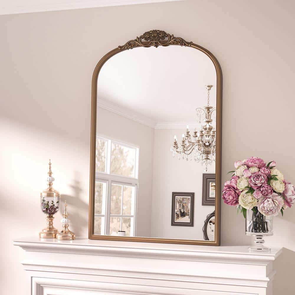 Elevate the aesthetic of your living space with our Arch Wall Mirror, a vintage-inspired masterpiece that adds a touch of timeless elegance. With its metal frame and baroque design, this decorative mirror is perfect for enhancing the ambiance of your home. The garland details on top is similar to the design of Primrose flowers. This mirror perfectly complements that style of traditional vintage furniture. The classic and practical mirror will be the most eye-catching in your room. The mirror is equipped with pre-installed hooks, which can be easily and quickly installed on the wall or directly against the wall. Suitable for living room, master bedroom, fireplace mantle, bathroom, foyer, entryway table.. Color Family: Gold. Color/Finish: Gold. Features: Deluxe Glass. Frame Material: Metal. Hardware Included: Yes. Mirror Orientation: Vertical / Horizontal. Mirror Type: Single. Mount Style: Floating. Mount Type: Wall. Product Weight (lb.): 11 lb. Shape: Rectangular. Mirror Height (in.): 30. Mirror Width: Medium (20-40 in.). Mirror Width (in.): 20. Product Height (in.): 30 in. Product Width (in.): 20 in. Thickness (in.): 1 in. Mirror Width: Medium (20-40 in.). Mirror Type: Single. Mirror Orientation: Vertical / Horizontal. Shape: Rectangular. Features: Deluxe Glass. Frame Material: Metal. Width (in.): 20 in. Mount Style: Floating