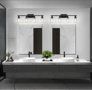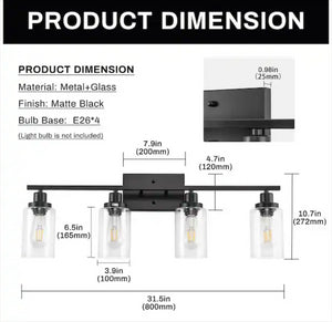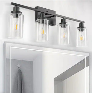 Add a modern industrial touch to your bathroom with this 32-inch, 4-light matte black vanity fixture. Featuring clear glass shades and a sleek design, it provides bright, even lighting perfect for vanities and mirrors.