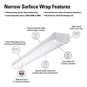 The Metalux Selectable 4 ft. LED Wrap is 5.5 in. wide. The Selectable Wrap has a durable polycarbonate lens, 1-piece stamped steel housing and decorative ends. The new Selectable Wrap has three selectable lumen options - 6000, 5000 or 4000 Lumens and 3 selectable CCTs -3500, 4000 or 5000K. It replaces 2 and 3 lamp 32-Watt fluorescent wraps and offers 120-277 universal voltage with 0-10-Volt dimming for even more energy savings. The Metalux Selectable wrap is ideal for commercial spaces like schools and offices or residential spaces like garages, laundry rooms and basements where surface or wall mounting is needed.. Actual Color Temperature (K): 3500,4000,5000. Color Rendering Index (CRI): 80. Color Temperature: Daylight. Color/Finish: White. Color/Finish Family: White. Damp/Wet Rating: Damp Rated (Covered Outdoor). Dimmable Capability: 0-10-Volt Dimming. Features: No Additional Features. Included: No Additional Items Included. Light Bulb Type Included: Integrated LED. Location Use: Office. Lumens: 6000. Material: Steel. Package Quantity: 1. Power Source: Hardwired. Product Length (ft): 4 ft. Product Weight (lb.): 6.940 lb. Product Width (ft): 0.46 ft. Recommended Mounting Height (ft.): 12 ft. Returnable: 90-Day. Voltage (V): 120/277 V. Wattage (W): 48 W. Certifications and Listings: ROHS,UL Certified,cULus Listed. Product Height (in): 3.40. Product Length (in): 48. Product Width (in): 5.5. Product Length (ft): 4 ft. Dimmable Capability: 0-10-Volt Dimming. Light Bulb Type Included: Integrated LED. Package Quantity: 1. Damp/Wet Rating: Damp Rated (Covered Outdoor). Location Use: Office. Recommended Mounting Height (ft.): 12 ft. Included: No Additional Items Included