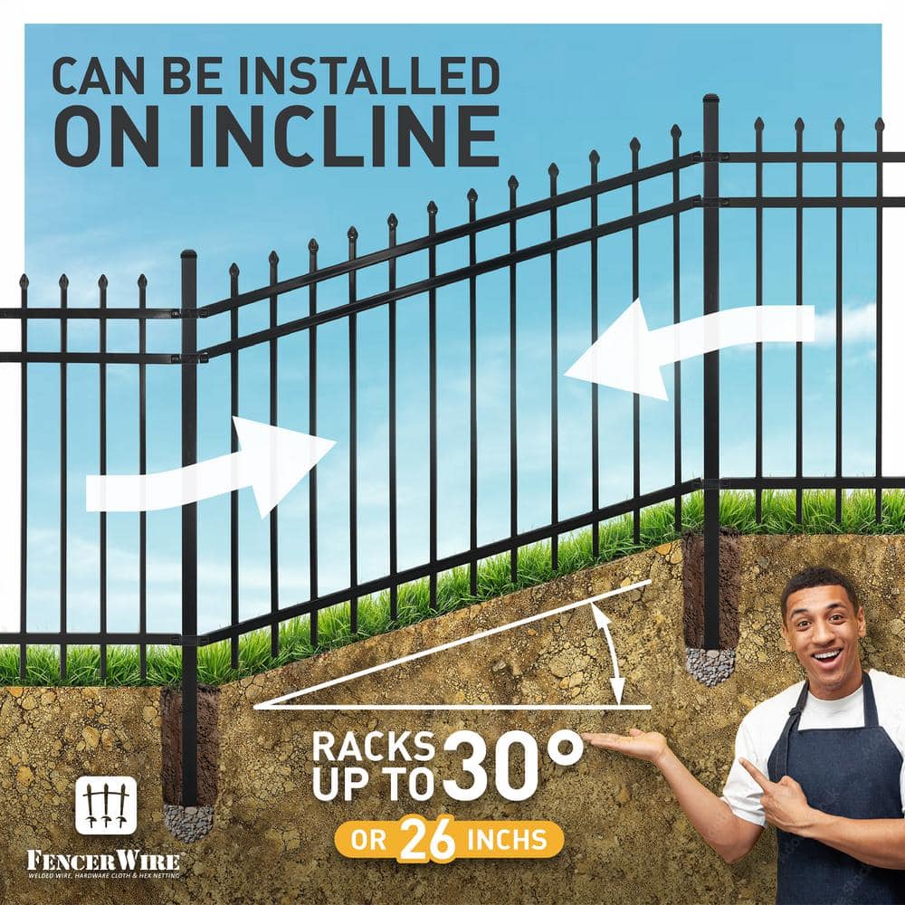 Fencer Wire Heavy Duty Pinnacle Fence Barrier Panel. 4 ft. Height X 8 ft. Width Anti-Rust Metal Fencing Panel. 2 in. Diameter Steel Outdoor Decorative Garden Fence Panel for Yard, Pool. Patio, Single Panel. Pinnacle Style Design: Elevate your outdoor space with our pinnacle style garden fence gate. The gate panel features a distinctive pointed top design, adding a touch of elegance and sophistication to any garden or yard. Crafted for durability and security, this gate can accommodate a lock, ensuring your space remains protected. Enhance the aesthetic appeal and functionality of your garden with the timeless charm of this pinnacle style fence gate.. Color Family: Black. Contact Type Allowed: Below Ground. Features: Galvanized,UV Protected,Water Resistant. Fencing Installation Type: Dig. Gauge: 14. Includes: No Additional Items Included. Material: Steel. Panel Assembly: Assembled Panel. Panel Design: Spaced Picket. Panel Pack Size: 1 Panel. Picket Top Style: Pointed. Product Weight (lb.): 45.4 lb. Actual panel height (in.): 46 in. Actual panel thickness (in.): 1.07 in. Actual panel width (in.): 94 in. Nominal panel height (ft.): 4 ft. Nominal panel width (ft.): 8 ft. Picket Spacing (in.): 3.9 in. Nominal panel height (ft.): 4 ft. Nominal panel width (ft.): 8 ft. Picket Top Style: Pointed. Fencing Installation Type: Dig. Panel Design: Spaced Picket. Material: Steel. Features: Galvanized. Gauge: 14