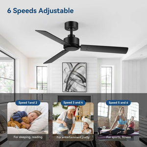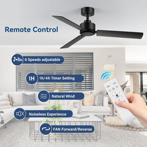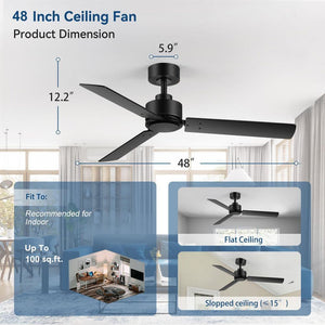 Built with an impressively powerful 164 RPM motor, this 48 in. Black Ceiling Fan is ideally suited to standard installations of 15 ft. x 15 ft. or larger. It delivers up to 6,899 CFM of maximum airflow, and an included wall-mount remote provides control for the fans 6-speeds. The contemporary styling and versatile black finish incorporate well into many decors, and its high-efficiency blade pitch allows greater air movement. This single-mount fan includes a 5 in. downrod for added convenience and ease of installation.. Blade Color: Black. Blade Color Family: Black. Blade Material: Plywood. Blade Pitch: 12. Blade Span (in.): 48 in. Ceiling Fan Design: Propeller,Standard. Commercial/Residential: Residential. Control Type: Remote. Damp/Wet Rating: Damp Rated (Covered Outdoor),Dry Rated (Indoor). Durability: Not Applicable. Features: Quick & Easy Install,Reversible Blades,Reversible Rotation,Timer. Housing Color: Black. Housing Color Family: Black. Housing Material: Steel. Included: Downrod Included,Remote Control Included. Indoor/Outdoor: Indoor. Location Use: Barn,Bedroom,Dining Room,Foyer,Garage,Kids Room,Kitchen,Living Room. Max. Airflow (CFM): 6899. Max. Motor Speed (RPM): 164 RPM. Motor Type: DC. Mounting Type: Downrod Mount. Number of Blades: 3. Number of Speeds: 6. Recommended Room Size: Large Room (400 sq. ft.). Returnable: 90-Day. Certifications and Listings: DOE. Assembled Depth (in.): 48 in. Assembled Height (in.): 12.2 in. Assembled Weight (lbs.): 13.7 lb. Assembled Width (in.): 48 in. Blade Length (in.): 20.3 in. Blade Width (in.): 4.7 in. Downrod Length (in.): 5. Blade Span (in.): 48 in. Max. Airflow (CFM): 6899. Number of Blades: 3. Mounting Type: Downrod Mount. Recommended Room Size: Large Room (400 sq. ft.). Indoor/Outdoor: Indoor. Features: Reversible Rotation. Motor Type: DC