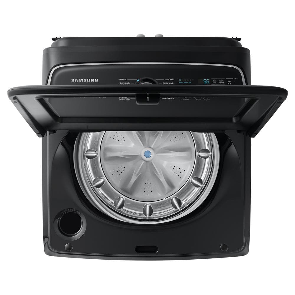 Samsung's 5.5 cu. ft. Extra-Large Capacity Top Load Washing Machine is equipped with Super Speed Wash, which powerfully cleans a full load of laundry in just 28 minutes. Without sacrificing cleaning performance. With Wi-Fi connectivity, you can remotely start, stop, or delay your smart washer from our simple-touse SmartThings App. Active WaterJet, a built-in water faucet, lets you easily pretreat heavily soiled and stained clothes.. Agitator/Impeller Type: Impeller. Amperage (A): 15 A. Appliance Category: Washer. Appliance Series: Not Applicable. Appliance Type: Top Load Washer. Color/Finish: Black. Color/Finish Family: Brushed Black. Control Type: Electro-Mechanical. Door Material: Glass. Energy Consumption (kWh/year): 120. Energy Efficiency Tier Rating: Not CEE rated. Hardware Color/Finish: Stainless Steel. Hardware Color/Finish Family: Stainless Steel. Included: Hoses,Power Cord. Maximum Spin Speed (RPM): 750. Number of Rinse Cycles: 2. Number of Rinse Temperatures: 5. Number of Wash Cycles: 12. Number of Wash Speeds: 5. Number of Wash Temperatures: 5. Product Weight (lb.): 134.5 lb. Returnable: Non-Returnable. Stackable: Not Stackable. Steam Function: No Steam. Voltage (volts): 120. Wash Cycles: Active Wear,Bedding,Colors,Delicates,Heavy Duty,Normal,Rinse & Spin,Whites. Washer Dispensers: Bleach,Fabric Softener. Washer Features: Control Lock,Control Sounds On/Off,Cycle Status Indicator,Delay Start,End-Of-Cycle Signal,High-Efficiency Detergent Required,Rear Control,Remote Diagnostics,Soft Close Lid,Spin Speed Option,Wi-Fi Enabled. Washer Tub/Drum Material: Stainless Steel Drum. Certifications and Listings: Energy Star. Capacity - Washer (cu. ft.): 5.5. Height With Lid Open 90 Degrees (In): 59.5. Product Depth (in.): 29.43 in. Product Height (in.): 45.81 in. Product Width (in.): 27.56 in. Capacity (cu. ft.): 5.5. Agitator/Impeller Type: Impeller. Features: End-Of-Cycle Signal. Features: Cycle Status Indicator. Features: Spin Speed Option. Features: Soft Close Lid. Features: Delay Start. Features: Wi-Fi Enabled