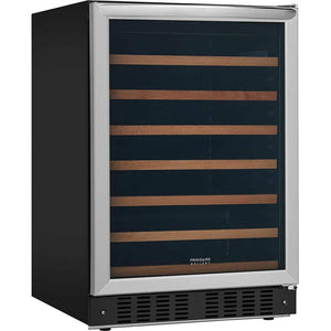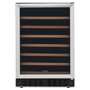 This undercounter wine cooler can be installed either built-in or freestanding. It features seven (7) wine shelves for a storage capacity of 52 standard bottles of wine. One shelf can be flipped upside-down to instead store 12 oz. cans of your favorite beverage or mixer. Digital controls keep wine and beverages cool under one single temperature setting. There is also interior LED lighting and the door hinge is field-reversible for extra versatility upon installation.. Holds up to 52 Wine Bottles for Maximum Storage. Built-In or Freestanding Installation Versatility. 2-in-1 Shelf Can Store Wine Bottles or 12 oz. Cans. Set temperature anywhere between 41 - 64 F, and the wine cooler will hold it precisely. Reversible Door Swing Option. Bright LED Interior Lighting and Temperature Display. Tinted Stainless Glass Door. Ready-Select Controls. Click here for more information on Electronic Recycling Programs . Cooler Width (in.): 23.438 in. No of Temperature Zones: Single Zone. Height to Top of Door Hinge (in.): 34.25 in. Bottle Storage Capacity: 52. Installation Type: Free Standing. Depth: 22.5 in. Cooling Unit Type: Compressor. Features: See-Thru Door