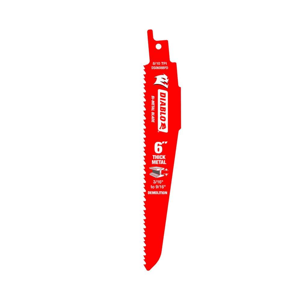 Diablo's reciprocating saw blades are specifically designed for maximum performance in metal demolition applications. The blade's ultra hardened cutting edge delivers up to 5X longer life compared to standard blades. A Dual Tooth design features an enhanced tooth configuration with small gullets for faster material removal and extra durability. An oversized blade body provides extreme durability and while Perma-SHIELD non-stick coating protects the blade from heat buildup, preventing gumming and corrosion.. Color Family: Red. Demolition: Yes. Material Cut: Metal. Number in Package: 1. Number of Teeth: 36. Power Tool Accessory Type: Reciprocating Saw Blade. Saw Blade Material: BiMetal. Teeth Per Inch: 0.8. Tools Product Type: Power Tool. Blade Length (in.): 6 in. Blade Width (in.): 1. Material Cut: Metal. Blade Length (in.): 6 in. Number in Package: 1. Saw Blade Material: BiMetal. Power Tool Accessory Type: Reciprocating Saw Blade. Number of Teeth: 36