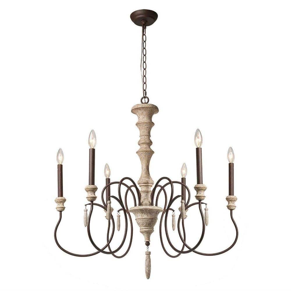Enhance your space with this ivory white shabby chic transitional chandelier, featuring elegant candelabras that cast a warm, welcoming glow. The design showcases gracefully curved arms adorned with charming wood beads, blending rustic charm with sophisticated style. Crafted from durable wood with vintage distressed finishes, the solid column exudes timeless appeal. Its oval-shaped linear design makes it perfect for dining areas, whether in traditional, rustic, farmhouse, coastal, or transitional interiors. This 6-light wood candlestick chandelier, inspired by French country decor, combines rust-textured curved arms and antique finishes to create a classic, versatile statement piece.. Chandelier/Pendant Design: Branch,Candle. Decorative Accents: No Decorative Accents. Dimmable Capability: Dimmable. Features: Adjustable Hanging Length,Assembly Required,Sloped Ceiling Adaptable. Fixture Color Family: Brown. Fixture Color/Finish: Aged Iron/Brown. Fixture Material: Wood. Fixture Shape: Circle. Included: Hardware Included,Hardware Included. Light Bulb Base Code: E12. Light Bulb Type Included: No Bulb(s) Included. Location Use: Bedroom,Dining Room,Foyer,Kitchen Island,Living Room. Max. Bulb Wattage (W): 40 W. Minimum Hanging Length (in.): 36.5 in. Number of Lights: 6. Product Weight (lb.): 9.9 lb. Recommended Light Bulb Shape: Tubular. Style: Traditional. Volt (v): 120. Certifications and Listings: UL Listed. Fixture Width (in.): 31 in. Maximum Hanging Length (in.): 92.5 in. Mounting Plate Width (in.): 5 in. Product Depth (in.): 31 in. Product Length (in): 32.5 in. Number of Lights: 6. Fixture Shape: Circle. Style: Traditional. Features: Adjustable Hanging Length. Fixture Material: Wood. Features: Sloped Ceiling Adaptable. Location Use: Dining Room. Chandelier/Pendant Design: Candle