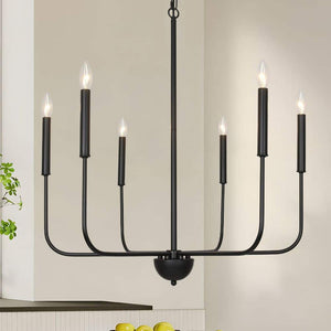 This chandelier is made of metal material with fine details and decorations. Each candle tube light holder can be fitted with a candle-like bulb, creating a soft and warm lighting effect. The 6-candle tube chandelier with black finish can adapt to the interior decoration style of classic, retro or country style, creating a bright and warm atmosphere.. Chandelier/Pendant Design: Candle. Decorative Accents: No Decorative Accents. Dimmable Capability: Dimmable. Features: Adjustable Hanging Length. Fixture Color Family: Black. Fixture Color/Finish: Black. Fixture Material: Iron. Fixture Shape: Circle. Included: Hardware Included. Light Bulb Base Code: E12. Light Bulb Type Included: No Bulb(s) Included. Location Use: Dining Room,Foyer,Kitchen Island,Living Room. Max. Bulb Wattage (W): 60 W. Minimum Hanging Length (in.): 23.6 in. Number of Lights: 6. Product Weight (lb.): 3.97 lb. Recommended Light Bulb Shape: Candle. Volt (v): 110. Certifications and Listings: ETL Certified. Fixture Width (in.): 26.1 in. Maximum Hanging Length (in.): 66.1 in. Mounting Plate Width (in.): 5.5 in. Product Depth (in.): 26.1 in. Product Length (in): 13.7 in. Number of Lights: 6. Fixture Shape: Circle. Features: Adjustable Hanging Length. Fixture Material: Iron. Location Use: Dining Room. Chandelier/Pendant Design: Candle. Location Use: Foyer. Location Use: Kitchen Island