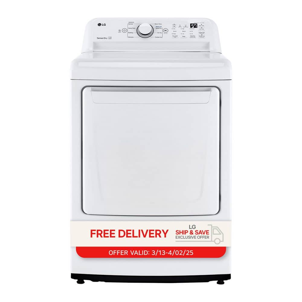 The LG Sensor Dry system keeps tabs on moisture levels throughout the cycle and automatically adjusts drying time as needed-so you don't have to. And with generous 7.3 cu. ft. capacity that fits more laundry in every load, this dryer makes laundry day easier all-around. FlowSense duct clogging indicator lets you know when your ducts need cleaning to avoid lint buildup and keep your dryer clean, efficient and safe.. Amperage (A): 15 A. Appliance Category: Dryer. Appliance Series: Not Applicable. Appliance Type: Electric Dryer. Capacity - Dryer (cu. ft.): 7.3. Color/Finish: White. Color/Finish Family: White. Control Type: Electro-Mechanical. Door Material: Solid Surface. Door Shape: Square Door. Door Style: Reversible. Dry Cycles: Air Fluff,Bedding,Cotton,Delicates,Heavy Duty,Permanent Press,Quick Dry,Sensor Dry,Touch Up,Wrinkle Free. Dryer Drum Material: Aluminized Alloy Steel Drum. Dryer Features: Adjustable Legs,Control Lock,Damp Alert,Four-Way Venting,Lint Filter,Moisture Sensor,Rear Control,Remote Diagnostics,Sensor Dry,Timed Dry. Dryer Fuel Type: Electric. Exhaust Vent Location: Back. Hardware Color/Finish: None. Hardware Color/Finish Family: None. Included: No Additional Items Included. Lint Filter Location: Top. Matching Washer Type: Top Load Matching. Number of Drying Cycles: 8. Number of Drying Temperatures: 3. Pedestal Model#: N/A. Product Weight (lb.): 114. Stackable: Not Stackable. Stacking Kit Model#: N/A. Steam Function: No Steam. Vent Type: Vented. Voltage (volts): 240. Certifications and Listings: CSA Certified,Energy Star,NSF Certified. Depth With Door Open 90 Degrees (in.): 50.25 in. Door Opening Height (In.): 21.25. Door Opening Width (In.): 21.25. Product Depth (in.): 29.5 in. Product Height (in.): 44.25 in. Product Width (in.): 27 in. Capacity (cu. ft.): 7.3. Voltage (volts): 240. Features: Lint Filter. Features: Sensor Dry. Vent Type: Vented. Features: Timed Dry. Features: Moisture Sensor. Width (in.): 27 in