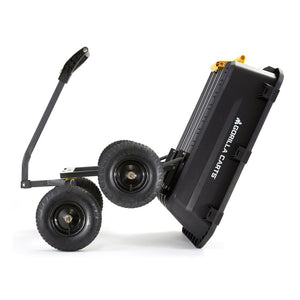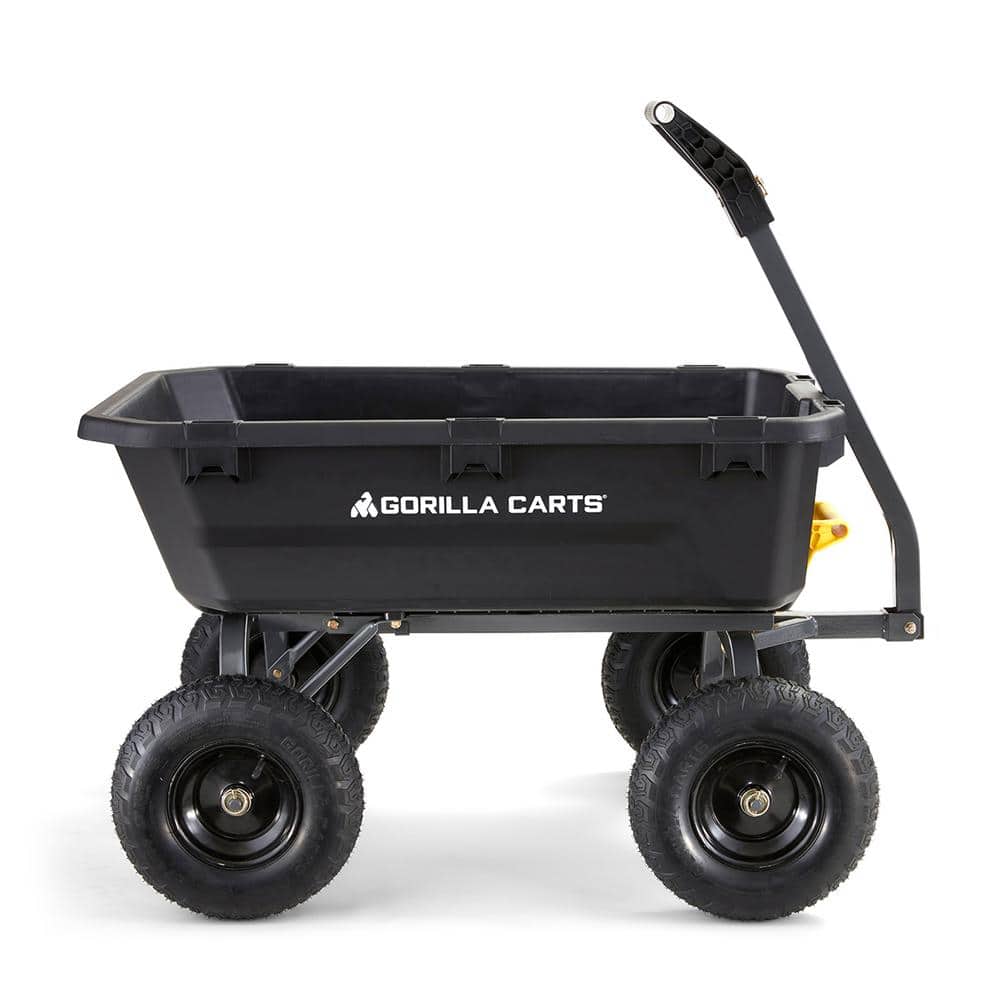 Ultimate toughness. Endless capability. Rugged by design, this 7 cu. ft. Poly Dump Cart is ready for a day of hauling dirt or taking on those not so small weekend projects. Gorilla Carts knows what is important to you when doing yard work. The newly-designed Poly Dump Cart is filled with features as innovative, updated frame design with a wider stance, zero-turn steering and an all-new full dump design. The patented full dump function makes it easy to unload all contents with the roll-over design. The large, thick poly bed is durable, easy to clean and wont rust. Refreshed by design, the 2-in-1 convertible handle is easier to convert to a tow handle. Simply remove the handle pin and slide the handle grip out of the way. With a 1,200 lbs. hauling capacity and large 13 in. pneumatic tires, this cart is always ready to tackle the project of the day.. Rugged by design, this 7 cu. ft. dump cart is ready for a day of hauling dirt or taking on those not so small projects, the all-new patented full dump function makes it easy to unload all contents with the roll-over design, the large poly bed is durable and easy to clean, refreshed by design, the convertible handle is easier to convert to a tow handle, simply remove the handle pin and slide the handle grip out of the way, with a 1,200 lbs. capacity and 13 in. pneumatic tires, this cart is always ready to tackle the project of the day. Exclusive all-new dump design for quick and full content unloading. 1,200 lbs. load capacity. Balanced 4-wheeled design. Patented 2-in-1 handle allows cart to be towed or pulled by hand. Durable, rugged poly bed is easy to clean and wont rust. New and improved frame design is durable and easy to assemble. 13 in. pneumatic tires to tackle any terrain. . Bin Material: Plastic. Capacity (cu. ft.) - Total: 7 cu ft. Wheel Material: Rubber. Handle Material: Steel. Tire Type: Pneumatic Tires