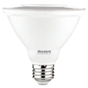 This Bulbrite 10-Watt LED PAR30 Short Neck 3000K General Purpose Bulb offers you shadow-free, uniform lighting. This PAR30 Short bulb showcases the latest LED technology in a design for greater control, as well as benefitting from a 40 beam angle for a perfect spotlight. The short neck is ideal for use in any narrow, confined space where you're looking for a flat ceiling light. It offers 3000 Kelvins of warm light to create an inviting atmosphere for your track or recessed lighting. Ideal for outdoor security lighting. It's also compatible with most transformers and dimmers. Average Life (hours): 25000. Beam Angle: 40. Bulb Color: White. Bulb Finish: Colored. Bulb Material: Glass. Bulb Shape: Reflector. Color Rendering Index (CRI): 80. Color Temperature: Soft White (2700K). Control Type: Switch. Dimmable Capability: Dimmable. Indoor/Outdoor: Indoor/Outdoor. Light Bulb Base Code: E26. Light Bulb Base Type: Medium. Light Bulb Features: Energy Saving. Light Bulb Shape Code: PAR30. Lighting Technology: LED. Lumens: 800. Max. Operating Temperature (F): 104 F. Number of Bulbs Included: 4. Rated: Wet Rated. Volt (v): 120. Wattage (Watts): 10. Wattage Equivalence: 75. Certifications and Listings: No Certifications or Listings. Product Diameter (in.): 3.69 in. Product Height (in.): 3.6 in. Light Bulb Shape Code: PAR30. Lighting Technology: LED. Number of Bulbs Included: 4. Max. Operating Temperature (F): 104 F. Light Bulb Base Code: E26. Light Bulb Base Type: Medium. Indoor/Outdoor: Indoor/Outdoor. Bulb Finish: Colored.
