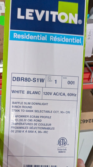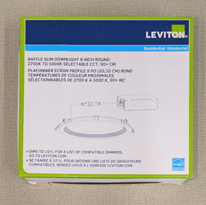 Leviton's 8 in. round aperture Baffle Slim Downlight, with selectable color temperature, offers the performance, ease of use and flexibility valued for today's residential and light commercial applications. The regressed baffle and edge-lit lens combine to create a more refined ceiling appearance and enhanced visual comfort. Users can change the color temperature of the light between 5 different values ranging from 2700K to 5000K with a simple switch. Pair this downlight with one of the many Leviton compatible dimmer control options to adjust for the desired light level.. Actual Color Temperature (K): 2700,3000,3500,4000,5000. Color Rendering Index (CRI): 90. Color Temperature: Selectable White. Color/Finish: White. Color/Finish Family: White. Commercial/Residential: Commercial,Residential. Damp/Wet Rating: Damp Rated,Dry Rated,Wet Rated. Dimmable Capability: Dimmable. Features: Low Glare. IC Rating: IC Rated. Included: Clip(s),Gasket(s),Quick Connect,Wiring Connectors. Indoor/Outdoor: Indoor. Light Bulb Type Included: Integrated LED. Lumens: 1400. Material: Aluminum. New Construction or Remodel: New Construction,Remodel. Pack Size: 1. Product Weight (lb.): 1.5 lb. Trim Style: Baffle. Voltage (V): 120 V. Watt Equivalence: 18. Wattage (W): 15 W. Certifications and Listings: Energy Star,IC Rated,Title 24,cETLus. Nominal Size (in.): 8 in. Product Diameter (in.): 1 in. Product Height (in.): 1.1875 in. Nominal Size (in.): 8 in. Wattage (W): 15 W. Pack Size: 1. Trim Style: Baffle. New Construction or Remodel: Remodel. Dimmable Capability: Dimmable. New Construction or Remodel: New Construction. Features: Low Glare