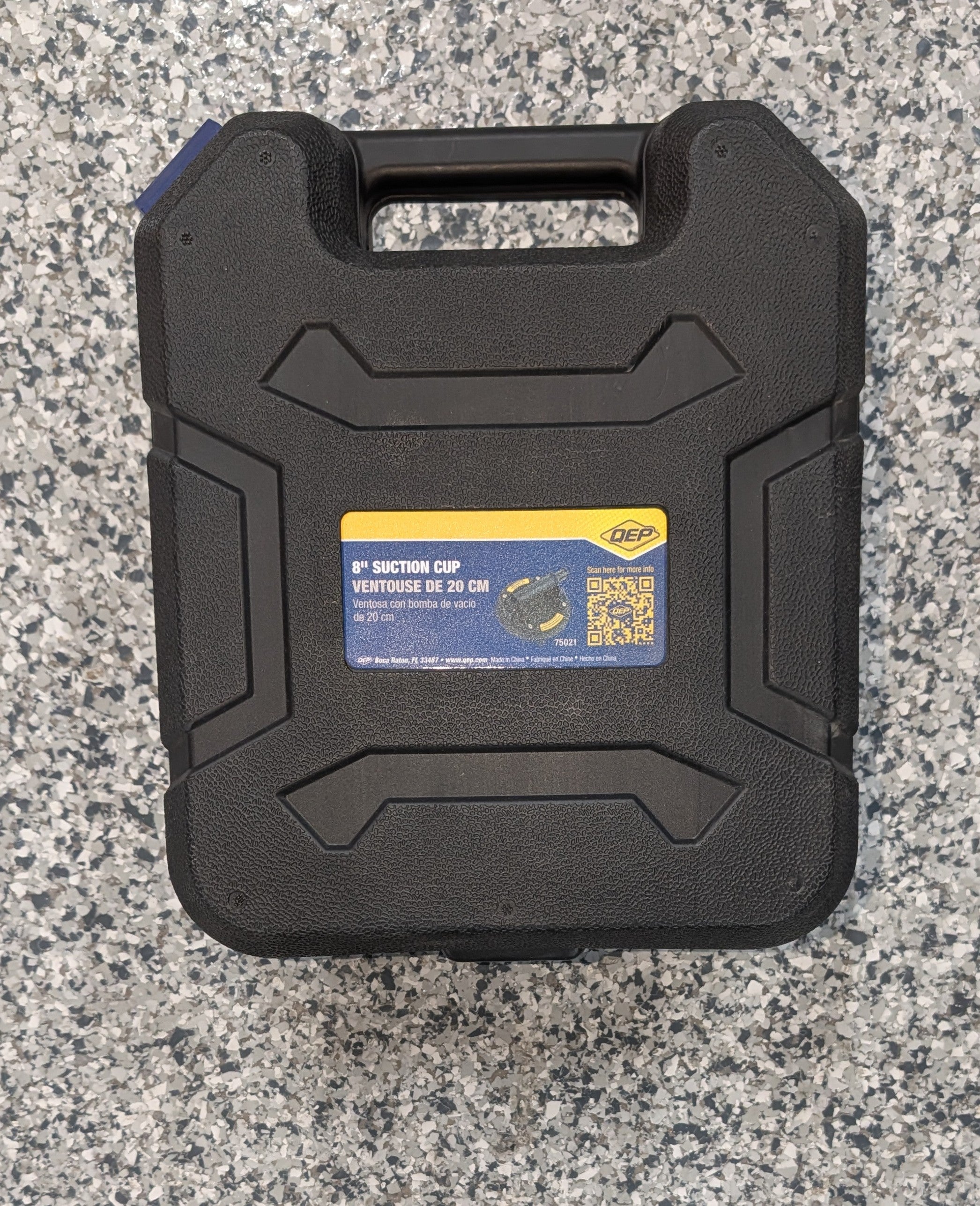 QEP 8 in. Vacuum Pump Suction Cup for Large Format Tile is expertly manufactured to lift, move and position non-porous materials including large format tile, stone, slabs, and glass. It features an 8 in. diameter heavy-duty vacuum suction cup with 242 lb. maximum lifting capacity, and an anti-slip handle for a comfortable grip. This is a hand-held vacuum pump suction cup that makes heavy lifting easy, and can be used to lift and move household items. It is easy to carry and includes a dust cover plate for protection, plus a durable carry case for easy transportation and storage.. Color Family: Black. Features: Heavy Duty,Includes Case. Flooring Product Type: Floor Suction Cups. Handle Material: Plastic. Lift Weight Maximum (lbs.): 242 lb. Material/Surface Use: Glass,Granite,Tile. Number of Suction Cups: Single. Pack Size: 1. Product Weight (lb.): 3.6 lb. Suction Cup Diameter (in.): 7 inch. Suction Type: Vacuum. Product Width (in.): 9.25 in. Lift Weight Maximum (lbs.): 242 lb