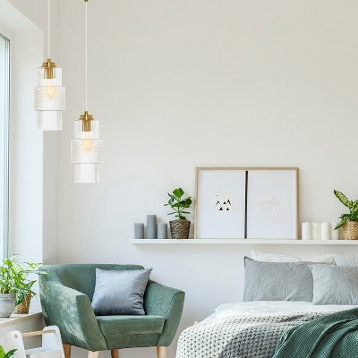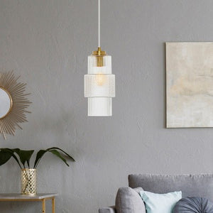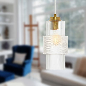 Add a statement piece to your interior lighting with this 9.75 H Noah Pillar Shade Pendant Light from River of Goods. Showcasing a brushed gold-finish metal base and a clear glass pillar shade with a wider, textured center, this pendant exudes retro style. It casts a warm, constant glow with one 40-watt E26 bulb (not included) and is also LED compatible. The adjustable hanging wire allows you to set the drop height to anywhere from 12.75 to 60.75 inches to best fit your space. Highlights: Overall dimensions 5in L x 5in W x 12.75-60.75in H Retro-style pendant light with pillar shade Gold-tone metal base and clear glass shade with wider, textured middle Features adjustable hanging wire Requires one 40W E26 bulb (not included) LED compatible UL listed Specifications: Includes: 1 Ceiling Light Fixture, Light Bulbs Not Included Dimensions (Overall): 60.75 Inches (H) x 5.0 Inches (W) x 5.0 Inches (D) Weight: 2.02 Pounds Shade Shape: Round Lumens: 460 Lighting Body Material: Metal Lighting Shade Material: Glass Bulb Base Size: Standard Edison Medium Screw Base E26 Features: Adjustable Lamp Height Cable/Cord Length: .5 Feet Assembly Details: Adult Assembly Required, Tools Not Provided Cord Covering: Wire Cable Number of Light Bulb Sockets: 1 Required, Not Included: Light Bulb(s) Maximum Light Bulb Wattage: 40 Watts Industry or Government Certifications: UL Listed Lighting Switch Type: No Switch on Fixture, Requires Hardwiring Number of Lighting Shades: 1 Requires Hardwired Installation: Yes Product warning: lighting: Not intended for outdoor use, turn off light fixture and allow to cool prior to replacing bulb, do not look directly at bulb, remove packaging before use, do not touch bulb when fixture is on, for use in dry locations only, keep flammable material away from lit bulb, keep out of reach of children and pets Height Adjustability: Adjustable Hanging Height Light settings: 1-Way (On Off) Maximum Hanging Height: 60.75 Inches Minimum Hanging Height: 12.75 Inches Battery: No Battery Used
