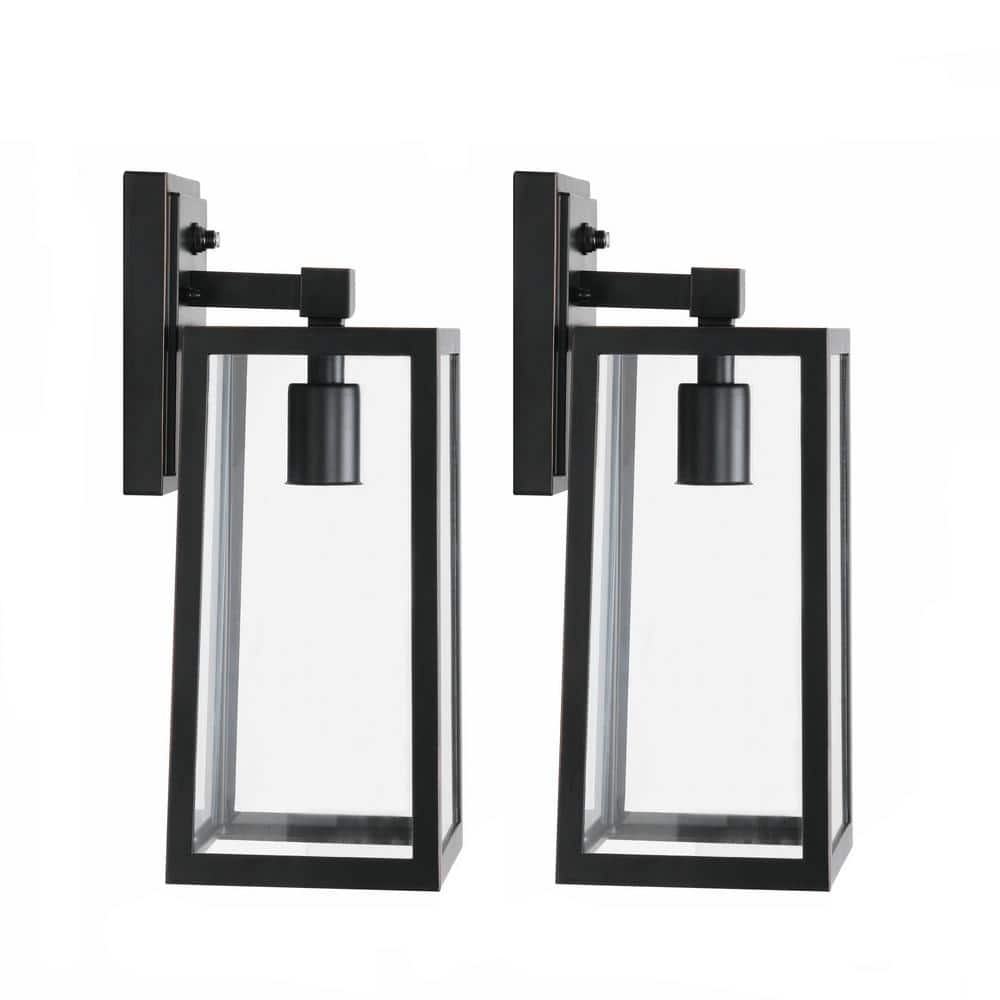 Add a touch of modern-inspired flair to the exterior of your home with this clean-lined outdoor wall lantern. This outdoor wall light illuminates your porch or patio with ease. Crafted for dry or damp environments, you can feel comfortable knowing this light is safe on the exterior of your home, under a covered porch, patio or veranda. Made from aluminum with a clear glass shade, this outdoor lantern accommodates one E26 bulb of up to 60W (bulb not included).. Compatible Bulb Type: No Bulbs Included. Damp/Wet Rating: Dry Rated,Wet Rated. Durability: Waterproof,Weather Resistant. Exterior Lighting Product Type: Sconce. Fixture Color/Finish: Black Dusk to Dawn. Fixture Material: Aluminum. Glass Type: Clear Glass. Included: Hardware Included. Indoor/Outdoor: Outdoor. Light Bulb Base Code: E26. Light Bulb Type Included: No Bulbs Included. Light Direction: Down. Max. Bulb Wattage (W): 60 W. Number of Lights: 1 Light. Outdoor Lighting Features: Dusk to Dawn. Package Quantity: 2. Power Source: Hardwired. Product Size: Medium. Product Weight (lb.): 6.5 lb. Recommended Light Bulb Shape Code: E26. Sconce Type: Lantern. Shade Material: Glass. Shape: Rectangle. Voltage Type: Low Voltage. Certifications and Listings: UL Listed. Mounting Plate Height (in.): 6.3 in. Mounting Plate Width (in.): 4.72 in. Product Depth (in.): 5.31 in. Product Height (in.): 14 in. Product Width (in.): 5.9 in. Sconce Type: Lantern. Number of Lights: 1 Light. Fixture Material: Aluminum. Outdoor Lighting Features: Dusk to Dawn. Damp/Wet Rating: Wet Rated. Power Source: Hardwired. Light Direction: Down. Durability: Weather Resistant