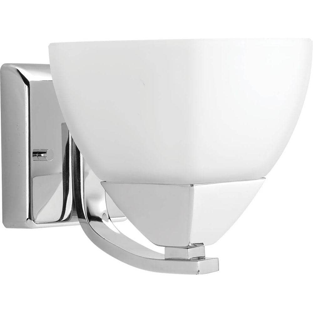 The Appeal Collection's distinctive forms highlight soft modern accents. Etched white glass shades balance nicely with the fixture's full back plate and simple square arms. Contributes to a desired spa-like effect.. Compatible Bulb Type: Incandescent. Connection Type: Hardwired. Damp/Wet Rating: Damp Rated. Features: No Additional Features. Fixture Color Family: Chrome. Fixture Color/Finish: Polished Chrome. Fixture Material: Steel. Included: Electrical Hardware,Mounting Hardware. Light Bulb Base Code: E26. Light Bulb Type Included: No Bulbs Included. Light Connection: Direct to Plate. Light Direction: Down,Up. Max. Bulb Wattage (W): 100 W. Mounting Deck Shape: Rectangle. Number of Lights: 1 Light. Product Weight (lb.): 4.4 lb. Recommended Light Bulb Shape Code: A19. Recommended Vanity Size (in.): 8. Shade Color Family: White. Shade Material: Etched Glass. Shade Type: Standard. Shape: Square. Style: Modern. Switch Included: Without Switch. Wattage (watts): 100. Certifications and Listings: CSA Listed,UL Listed,cUL Listed. Fixture Height (in.): 6.25 in. Fixture Width (in.): 5.625 in. Mounting Plate Height (in.): 6.25 in. Mounting Plate Width (in.): 5.625 in. Product Depth (in.): 7.25 in. Connection Type: Hardwired. Shade Material: Etched Glass. Style: Modern. Shape: Square. Number of Lights: 1 Light. Light Bulb Base Code: E26. Fixture Width (In.): 5.625 in. Fixture Material: Steel