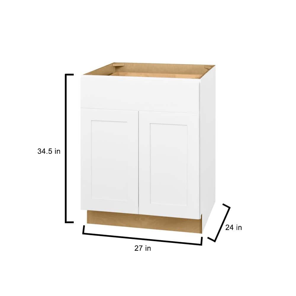 Expand your lower storage setup with this Hampton Bay Avondale shaker kitchen base cabinet. The open top allows seamless integration with a countertop or sink, and the Ready-To-Assemble design ensures quick installation. With shaker details and alpine white finish, this storage unit gives your kitchen a crisp, timeless appeal. A soft-close mechanism lets you open and shut the doors and drawer smoothly. This Hampton Bay Avondale shaker alpine kitchen base cabinet comes with a preassembled face frame to conceal exposed edges.. Box Material: Plywood. Cabinet Construction: Framed. Cabinet Door Height (in.): 22.5. Cabinet Door Width (in.): 13.18. Cabinet Finish: Painted. Cabinet Material: Plywood. Cabinet Shade: Light. Cabinet Type: Base. Color Family: White. Color/Finish: Alpine White. Door Handing: Left-Handed. Door Material: MDF. Finished End: Right and Left. HUD Approved: No. Kitchen Cabinet Features: Adjustable Shelves,Soft Close Doors,Soft Close Drawers. Number of Drawers: 1 Drawer. Number of Shelves: 1 Shelf. Overlay Type: Full. Returnable: 90-Day. Assembled Depth (in.): 24 in. Assembled Height (in.): 34.5 in. Assembled Width (in.): 27 in. Interior Cabinet Depth (in.): 24 in. Shelf Thickness (in.): 0.75 in. Cabinet Type: Base. Assembled Width (in.): 27 in. Door Material: MDF. Assembled Height (in.): 34.5 in. Assembled Depth (in.): 24 in. Box Material: Plywood. Cabinet Finish: Painted. Cabinet Shade: Light