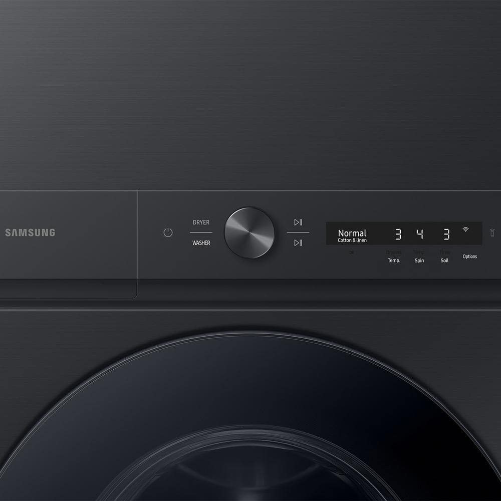 Samsung's Bespoke AI Laundry Hub 4.6 cu. ft. Large Capacity Front Load stacked washer and dryer with an Easy Reach control panel, offers a space-saving solution in one single machine. Complete with AI powered features that make laundry day easier.. Agitator/Impeller Type: Impeller. Amperage (A): 15 A. Appliance Series: Samsung BESPOKE. Appliance Type: Washer & Dryer Combo. Capacity - Dryer (cu. ft.): 7.6. Color/Finish: Brushed Black. Color/Finish Family: Black. Control Type: Digital. Door Material: Glass. Dry Cycles: Active Wear,Air Fluff,Bedding,Delicates,Heavy Duty,Permanent Press,Quick Dry,Rack Dry,Sanitize,Timed Dry,Towels and Sheets,Wool,eDry. Dryer Door Style: Left Swing. Dryer Drum Material: Stainless Steel Drum. Dryer Features: Adjustable End-of-Cycle Signal,Adjustable Legs,Automatic Temperature Control,Control Lock,Control Sounds On/Off,Delay Start,Digital Cycle Countdown,Door Window,Energy Saver,Front Control,Heat Pump,Interior Light,Lint Filter,Moisture Sensor,Remote Diagnostics,Sensor Dry,Small Load,Spin Speed Option,Timed Dry,Wi-Fi Enabled. Dryer Fuel Type: Electric. Energy Consumption (kWh/year): 608. Energy Efficiency Tier Rating: Tier III. Exhaust Vent Location: Back,Left Side,Right Side. Hardware Color/Finish: Black. Hardware Color/Finish Family: Black. Included: Power Cord. Lint Filter Location: Front. Maximum Spin Speed (RPM): 1200. Number of Drying Cycles: 18. Number of Drying Temperatures: 5. Number of Rinse Cycles: 5. Number of Rinse Temperatures: 5. Number of Wash Cycles: 24. Number of Wash Speeds: 5. Number of Wash Temperatures: 5. Power Options: Plug-in. Product Weight (lb.): 319.7 lb. Remote Access: Remote Access. Requires Hub?: No Hub Required. Returnable: Non-Returnable. Smart Home: Smart Home Enabled. Smart Home Protocol: Wi-Fi. Steam Function: Steam. Vent Type: Vented. Voice Control Hub Required: Voice Control via Proprietary App. Voltage (volts): 240. Wash Cycles: Active Wear,Allergen,Bedding,Cold,Colors,Delicates,Normal,Permanent Press,Rinse & Spin,Small Load,Speed Wash,Steam,Towels and Sheets. Washer Dispensers: Bleach,Fabric Softener,Liquid Detergent. Washer Features: Adjustable Legs,Automatic Temperature Control,Control Lock,Control Sounds On/Off,Cycle Status Indicator,Delay Start,Door Window,End-Of-Cycle Signal,Front Control,High-Efficiency Detergent Required,Interior Light,Spin Speed Option,Water Heater,Wi-Fi Enabled. Washer Tub/Drum Material: Stainless Steel Drum. Works With: Alexa, Google Assistant, Homey, Samsung SmartThings. Certifications and Listings: Energy Star. Capacity - Washer (cu. ft.): 4.6. Depth With Door Open 90 Degrees (in.): 53.1 in. Door Opening Height (In.): 23.46. Door Opening Width (In.): 23.48. Dryer Door Opening Height (in.): 23.46. Dryer Door Opening Width (in.): 23.48. Product Depth (in.): 31.4 in. Product Height (in.): 74.4 in. Product Width (in.): 27 in. Capacity (cu. ft.): 4.6. Dryer Fuel Type: Electric. Vent Type: Vented. Width (in.): 27 in. Features: Front Control. Features: Door Window. Features: End-Of-Cycle Signal. Features: Wi-Fi Enabled