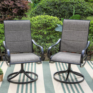 PHI VILLA Dining Chairs with elegant and classic black design bring unique aesthetic feeling to your patio, lawn, garden. Powder-coated heavy-duty steel frame and rust and weather resistant ensure long-lasting outdoor use. Ergonomic back support and curved smooth arms enables users to feel no fatigue after a long time sitting on these chairs. Round swivel base, 360 spin and breathable fabric take you a really comfortable relaxing time. Perfect for having dinner or party with your friends and family for all seasons.. Assembly Required: Yes. Chair Height Type: Standard Dining Height. Chair Style: Armchair. Chair Type: Dining Chair. Chair Weight Capacity (lb.): 300 lb. Commercial/Residential: Residential. Frame Finish: Black. Frame Material: Steel. Frame Primary Finish: Black. Included: No additional items included. Patio Furniture Features: Ergonomic,Swivel. Product Weight (lb.): 61.56 lb. Seat Color: Brown-Gray. Seating Type: Without Cushion. Weight Capacity (lb.): 300 lb. Assembled Depth (in.): 21.9 in. Assembled Height (in.): 39.8 in. Assembled Width (in.): 22.9 in. Chair Back Height (in.): 23. Chair Back Width (in.): 21.9. Chair Seat Depth (in.): 21.9. Chair Seat Width (in.): 21.9. Seat Height (in.): 16.5. Chair Type: Dining Chair. Frame Primary Finish: Black. Chair Style: Armchair. Patio Furniture Features: Swivel. Frame Material: Steel. Patio Furniture Features: Ergonomic. Commercial/Residential: Residential. Frame Finish: Black