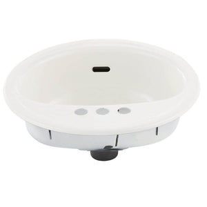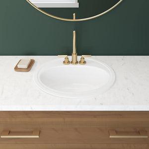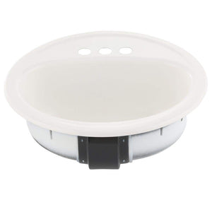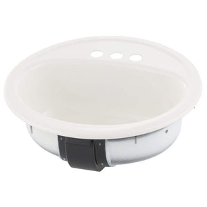 Laurel is a 19 in. round self-rimming drop-in porcelain steel lavatory. The Laurel features a flat mounting surface that rests on the counter space. The Laurel has 3 pre-drilled holes that are compatible with all the latest types of bathroom faucets.. Has three (3) pre-drilled holes. Quick and easy DIY installation - stud and clip assembly incuded. Enameled steel finish resistant to rust, air, salt and humidity. Laurel has a smooth sterile and odorless porcelain surface that cleans with non-abrasive household cleansers. Laurel lavatory has a classic design that matches any bathroom decor. Laurel is a self rimming round lavatory constructed from a single piece of steel. Laurel's stud and clip assembly is included for a quick and easy DIY installation and the laurel clip assembly saves time, money and less materials. Note: product may vary by store. Color Family: White. Color/Finish: White. Drain Finish: Whitewash. Faucet Hole Spacing (in.): 4 In. Centerset. Features: Fade Resistant,Predrilled Holes. Finish Family: Whitewash. Included: Mounting Hardware. Material: Porcelain. Overflow location: Front. Product Weight (lb.): 10 lb. Shape: Round. Certifications and Listings: CSA Listed. Bathroom Sink Front to Back Width (In.): 19 inches. Bathroom Sink Left to Right Length (In.): 19. Bathroom Sink Top to Bottom Depth (in.): 6.5 inches. Cut-Out Below Counter Depth (in.): 18. Cut-Out Depth (in.): 7.8125 in. Cut-Out Width (in.): 18 in. Inner bowl front to back length (in.): 11.125 in. Inner bowl side to side width (in.): 15.75 in