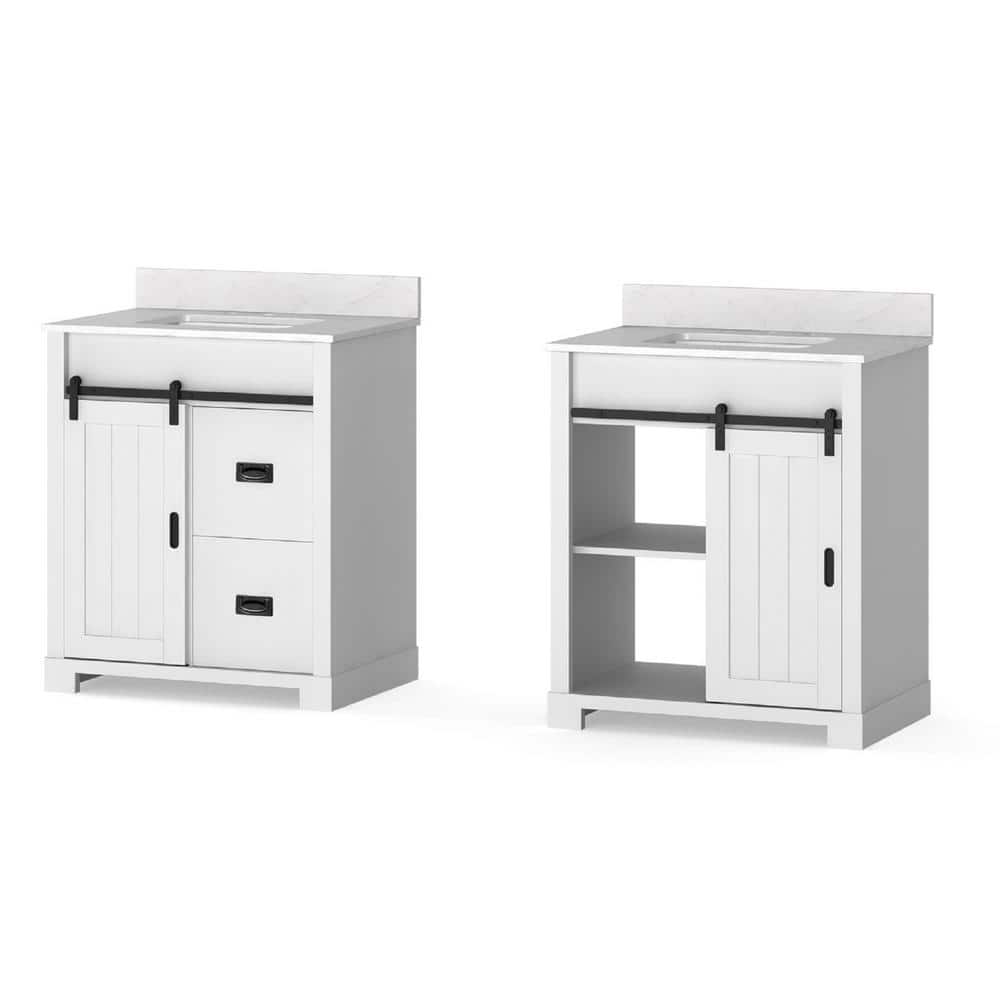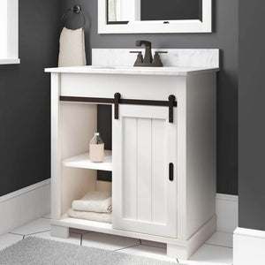 Complete your bathroom with this stylish and functional vanity by Glacier Bay. The functional barn door and 2 pull out drawers. Which provide ample storage for all your bathroom essentials.. Sliding barn door is unique and practical. 30 in. size is ideal for a small bathroom. Durable engineered stone top and backsplash with light veining. Decorative hardware included. Cabinet and 2 drawers provide ample storage. 30 in. vanity with functional barn door hardware. Modern design with rustic charm. Add style and functionality to any bathroom. Number of Sinks: Single Sink. Cabinet Material: Medium Density Fiberboard (MDF). Sink Location: Center. Sink Type: Undermount. Vanity Type: Freestanding. Sink Shape: Rectangular. Mirror Included: Mirror Not Included. Faucet Hole Spacing (in.): 4 in. Faucet Hole Spacing