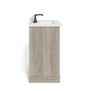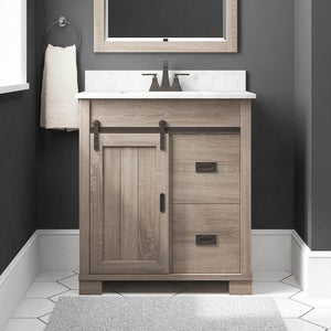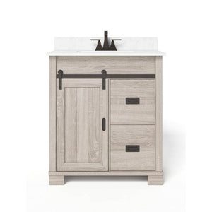 Complete your bathroom with this stylish and functional vanity by Glacier Bay. The functional barn door and 2 pull out drawers. Which provide ample storage for all your bathroom essentials.. Assembled: Assembled. Backsplash Included: Backsplash Included. Cabinet & Top Assembled weight (lbs): 145. Cabinet Color: Weathered Gray. Cabinet Color Family: Gray. Cabinet Material: Medium Density Fiberboard (MDF). Cabinet Shade: Light. Faucet Hole Spacing (in.): 4 in. Faucet Hole Spacing. Faucet Included: Faucet Not Included. Hardware Finish Family: Pewter. Included: No Additional Included Components. Mirror Included: Mirror Not Included. Number of Drawers: 2. Number of Shelves Included in Cabinet: 2. Number of Sinks: Single Sink. Sink Color: Carrera. Sink Color Family: White. Sink Location: Center. Sink Material: Ceramic. Sink Shape: Rectangular. Sink Type: Undermount. Style: Modern. Top Color: White with Natural Veining. Top Color Family: White. Top Material: Engineered stone composite. Top weight (lb.): 30. Vanity Features: Adjustable Shelves,Predrilled,Soft Close Doors,Soft Close Drawers. Vanity Top Edge Type: Bevel. Vanity Type: Freestanding. Backsplash Height (in.): 4.00. Basin Depth (in.): 7.3. Basin Length (in.): 20. Basin Width (in.): 20. Cabinet Depth (in.): 21.00. Cabinet Height (in.): 34.50. Cabinet Width (in.): 30.00. Product Depth (in.): 20.00 in. Product Height (in.): 34.5 in. Product Width (in.): 30.00 in. Vanity Top Thickness (in.): 1.4. Number of Sinks: Single Sink. Cabinet Material: Medium Density Fiberboard (MDF). Sink Location: Center. Cabinet Shade: Light. Mirror Included: Mirror Not Included. Sink Shape: Rectangular. Faucet Hole Spacing (in.): 4 in. Faucet Hole Spacing. Sink Type: Undermount