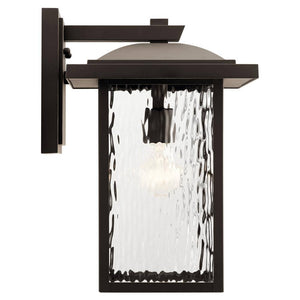 The Kichler Capanna 16 in. 1-Light Olde Bronze Outdoor Wall Light features a unique design that blends well with various decor styles. Its clear water glass diffuser provides a bright glow to your space. This outdoor wall light has a robust aluminum frame that provides excellent support and stability. It is ideal for illuminating your deck, porch, patio, or balcony.. Aluminum frame construction ensures strength and durability. Uses one 100-Watt incandescent medium-base A19 bulb (not included). ETL rated for safe use in wet locations. Clear water glass diffuser lends a radiant glow to your space. Comes with a base backplate for secure installation. Features an elegant olde bronze finish. Helps accentuate the visual appeal of your space. Click here for more information on Electronic Recycling Programs . Sconce Type: Lantern. Number of Lights: 1 Light. Power Source: Hardwired. Light Direction: Down. Fixture Material: Aluminum. Damp/Wet Rating: Wet Rated. Glass Type: Clear Glass. Durability: Waterproof