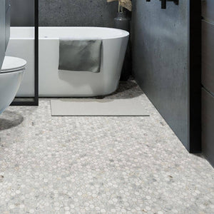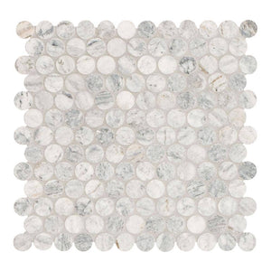 The Capri Blue Penny Round Honed Marble Mosaic Tile blends timeless charm with coastal elegance, showcasing precisely cut circular marble pieces in soft blue-gray tones interwoven with white and gentle veining. The honed matte finish enhances the stone's organic beauty, creating a calming, spa-like aesthetic ideal for serene and stylish interiors. Perfect for backsplashes, shower floors, accent walls, or fireplace surrounds, this natural marble mosaic pairs beautifully with cool palettes, brushed nickel, or polished chrome fixtures. Its classic penny round design adds subtle texture and sophistication, making it a versatile choice for coastal, transitional, or contemporary spaces.. Application Location: Backsplash,Floor,Wall. Color Family: Blue. Color/Finish: Capri Blue. Commercial / Residential: Commercial / Residential. Edge Type: Flat. Flooring Product Type: Mosaic Tile. Flooring and Tile Look: Geometric. Indoor/Outdoor: Indoor,Outdoor. Location: Bathroom,Fireplace,Floor,Kitchen,Patio,Shower. Mosaic Pattern: Penny. Returnable: Shower Floor Compatibility: Not Compatible. Tile Features: No Additional Features. Tile Finish: Honed. Tile Format: Standard. Tile Material: Marble. Water Protection: Water Resistant. Approximate Tile Size: 12x12. Mosaic Sub Unit Length (in.): 1. Mosaic Sub Unit Width (in.): 1. Product Length (in.): 12.44 in. Product Thickness (mm): 10 mm. Product Width (in.): 11.70 in. Suggested Grout Line Size: 1/8. Approximate Tile Size: 12x12. Tile Finish: Honed. Application Location: Floor. Flooring and Tile Look: Geometric. Application Location: Wall. Location: Bathroom. Location: Shower. Location: Floor