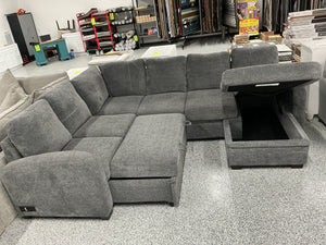 Coddle Aria Fabric Sleeper Sofa with Reversible Chaise and Storage, Gray (2) Power Outlets with One USB Outlet and One USB-C Outlet Lift Up Storage in Chaise Pull out Sleeper Under Loveseat Chaise is Reversible