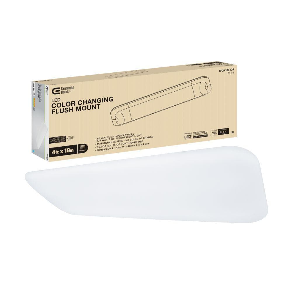 Brighten your home or office with Commercial Electric 4ft. x 1.5ft. LED Flush Mount Ceiling Light by replacing your outdated fluorescent lights with an energy-efficient integrated LED fixture. With its low-profile design, this traditional ceiling light can be installed in spaces with low ceiling clearance and seamlessly blend into your lighting aesthetic. Prior to installation, adjust the color temperature between Soft White, Bright White or Daylight and it is dimmable. While emitting 5800 Lumens of brightness, the smooth frosted lens produces crystal-clear even light distribution with no yellowing, discoloration, or dark spots over time. This flush mount offers a premium LED light engine ensuring maintenance free service with no bulbs to replace. Ideal for kitchen, laundry room, bathroom, bedroom, basement, office, corridors/hallways, and retail spaces and so much more. 65-Watt energy efficient LED replaces 128-Watt fluorescent light. Adjust color of light between Soft White, Bright White, Daylight. 5800 Lumens of brightness using only 65-Watts of electricity. COLOR TEMPERATURE OPTIONS: 3000K Soft White, 4000K Bright White and 5000K Daylight. Replaces outdated 128-Watt fluorescent light. Dimmable down to 10% - Suggested LED dimmer switches LUTRON: DVCL-153PR, CTCL-153PH, LEVITON: R62-06674-POW - *Full dimmer switch list on Specification sheet located in Product Details click Additional Resources. 120 Volts - Energy Star Rated. Operates reliably in sub-zero applications down to -4 F up to 113 F. Product Dimensions: 48.89in. L x 16.91in. W x 3.27in. H - Weight: 8.70lbs. Rated life up to 50,000 hours when using 3 hours a day. Actual Color Temperature (K): 3000,4000,5000. Color Rendering Index (CRI): 80. Color Temperature: Bright White, Daylight, Soft White. Damp/Wet Rating: Damp Rated. Dimmable Capability: Dimmable. Features: Dimmable. Fixture Color/Finish: White. Fixture Material: Acrylic. Hardware Included: Yes. Included: Installation Instructions. Indoor/Outdoor: Indoor. Integrated LED Type: Selectable. Max. Bulb Wattage (W): 65 W. Package Quantity: 1. Product Type: Flush Mount Lighting. Product Weight (lb.): 8.70 lb. Shade Product Type: With Shade. Shape: Rectangle. Voltage: Line Voltage. Watt Equivalence: 128. Certifications and Listings: ETL Listed, FCC Listed. Fixture Height (in.): 3.27 in. Fixture Width (in.): 16.91 in.